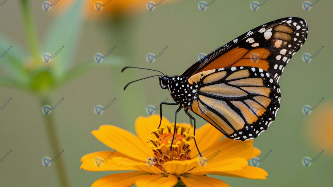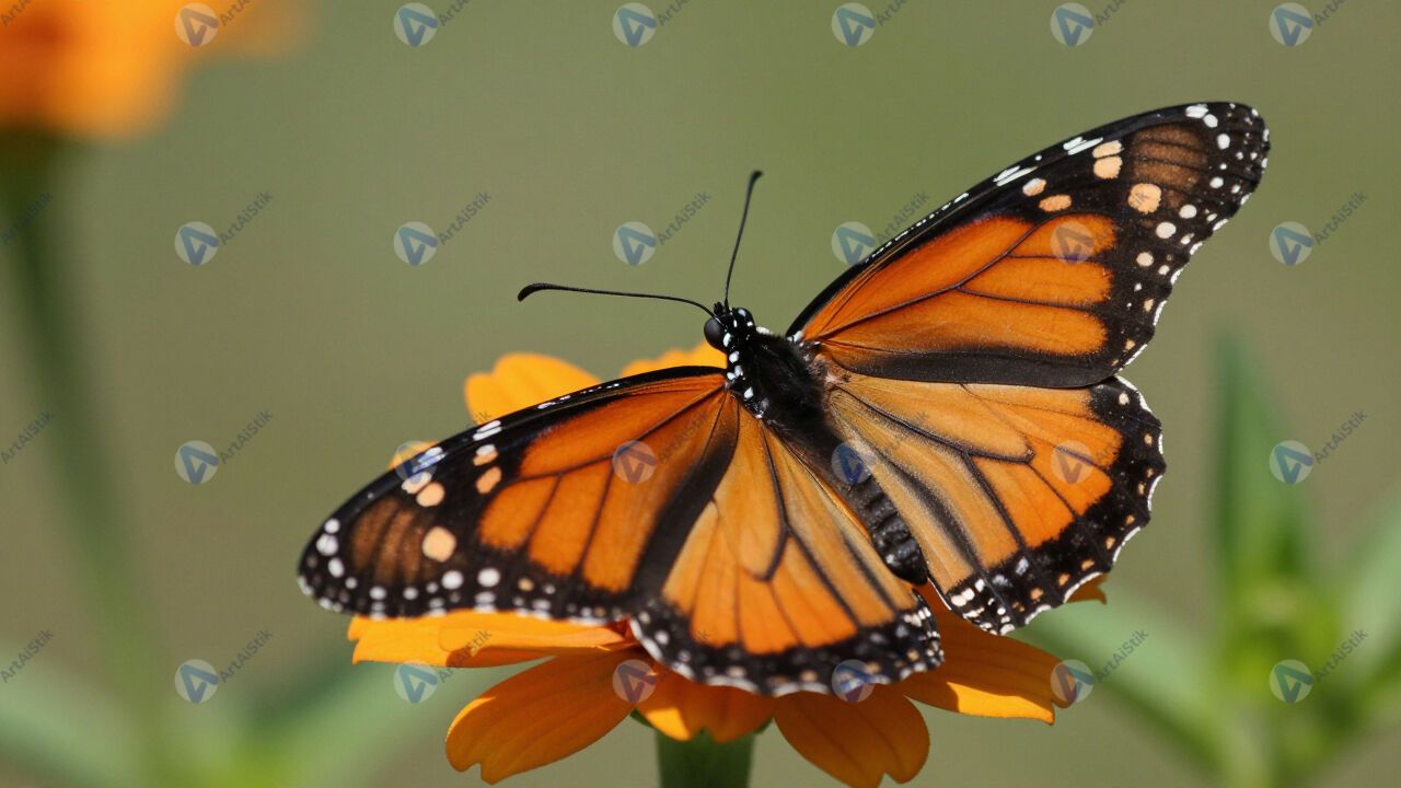 Бабочка монарх на цветке, оранжевые крылья, макро.