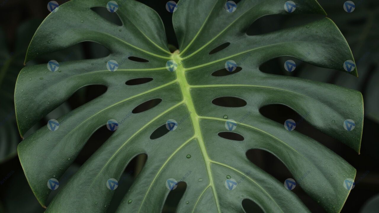 Лист монстеры с дырками, тропический, крупный план.