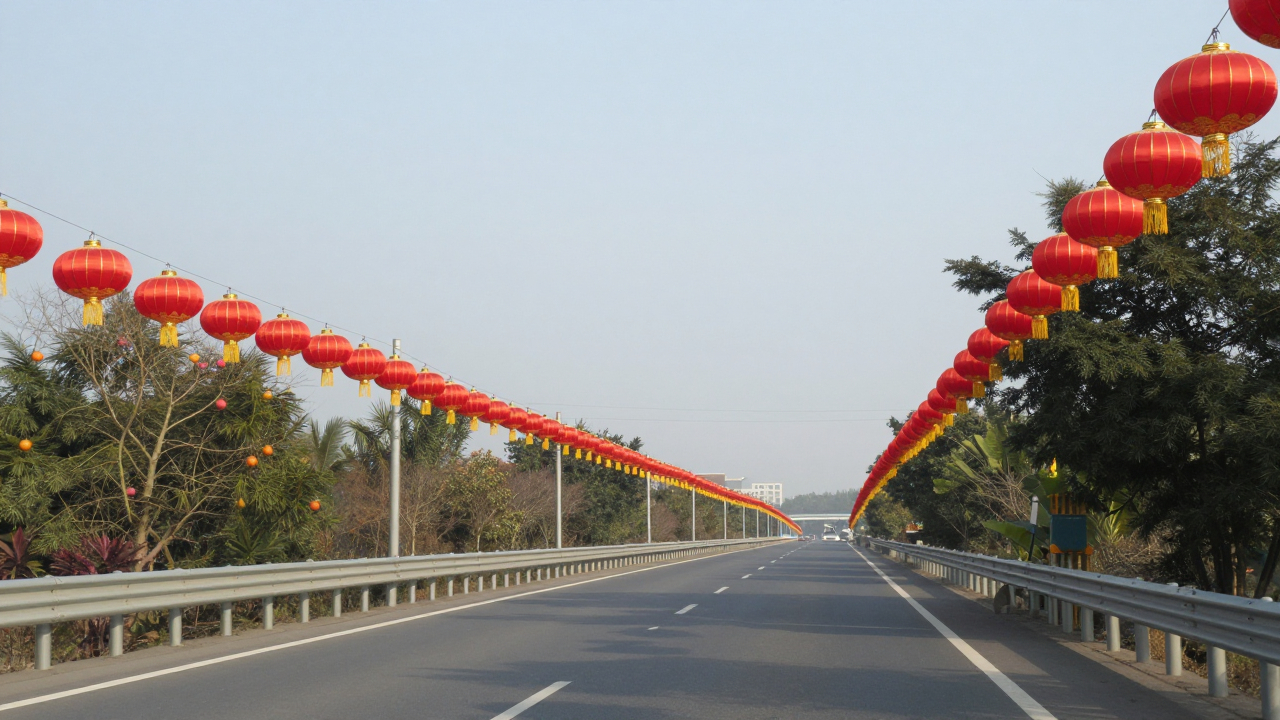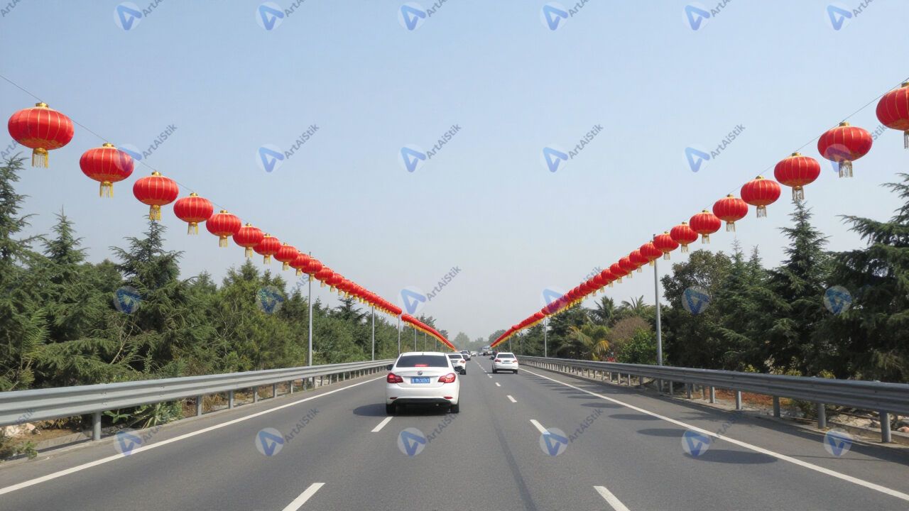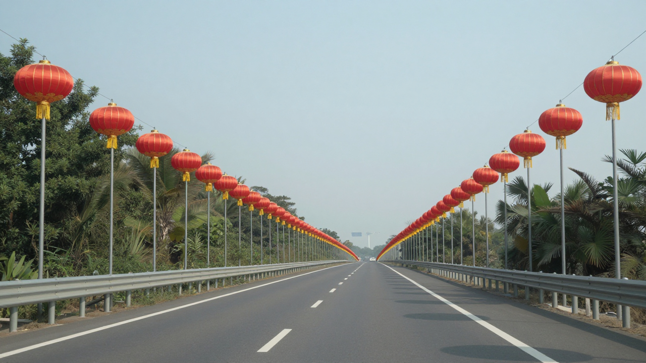 Автомагистраль в дневное время, ряды фонарей вдоль дороги.