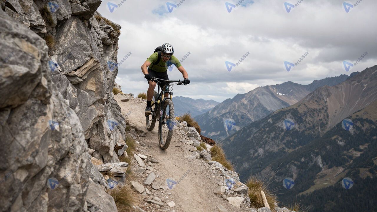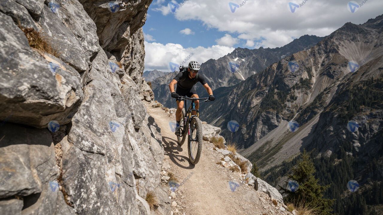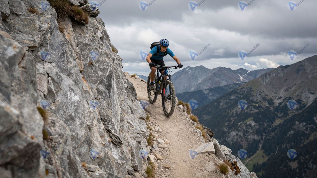 Маунтинбайкер на узкой горной тропе над обрывом.