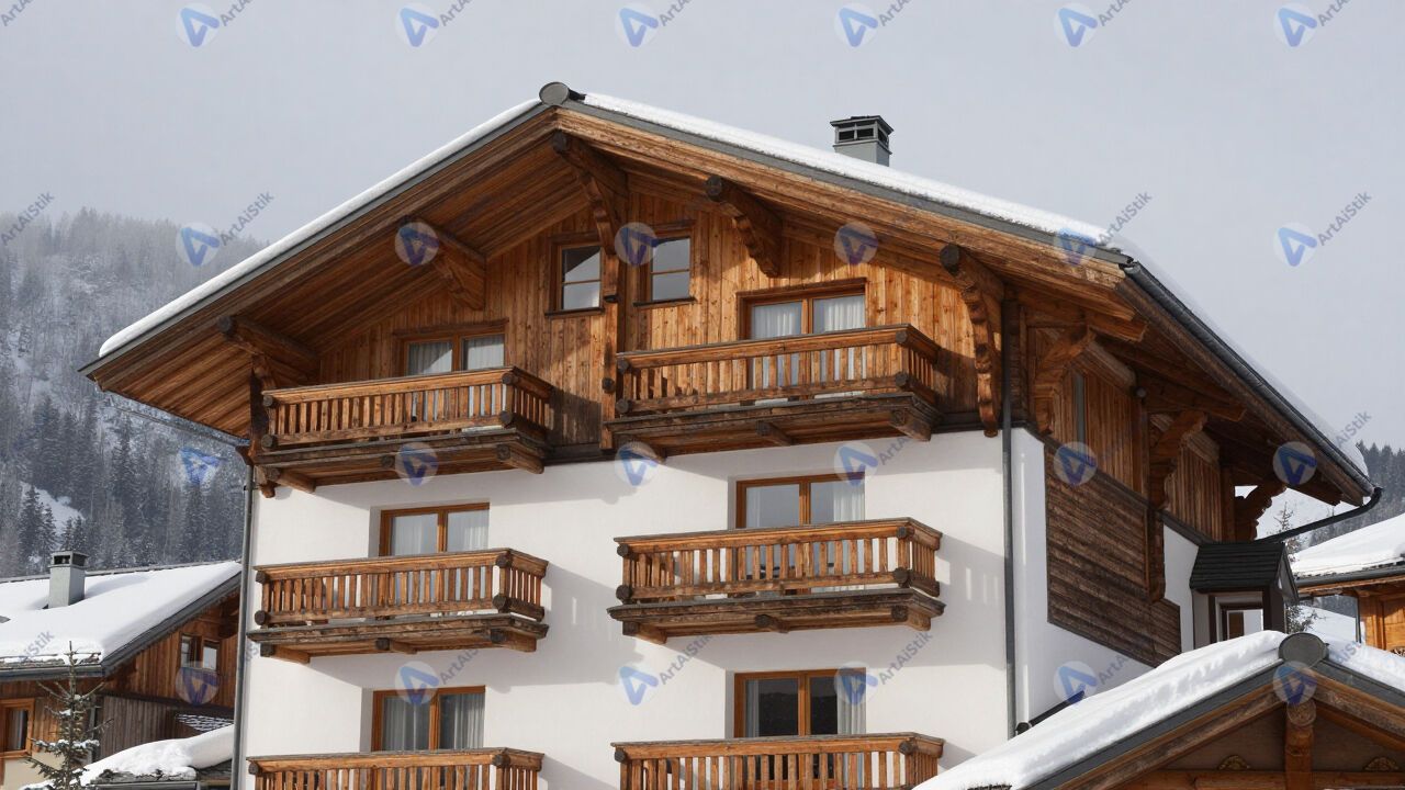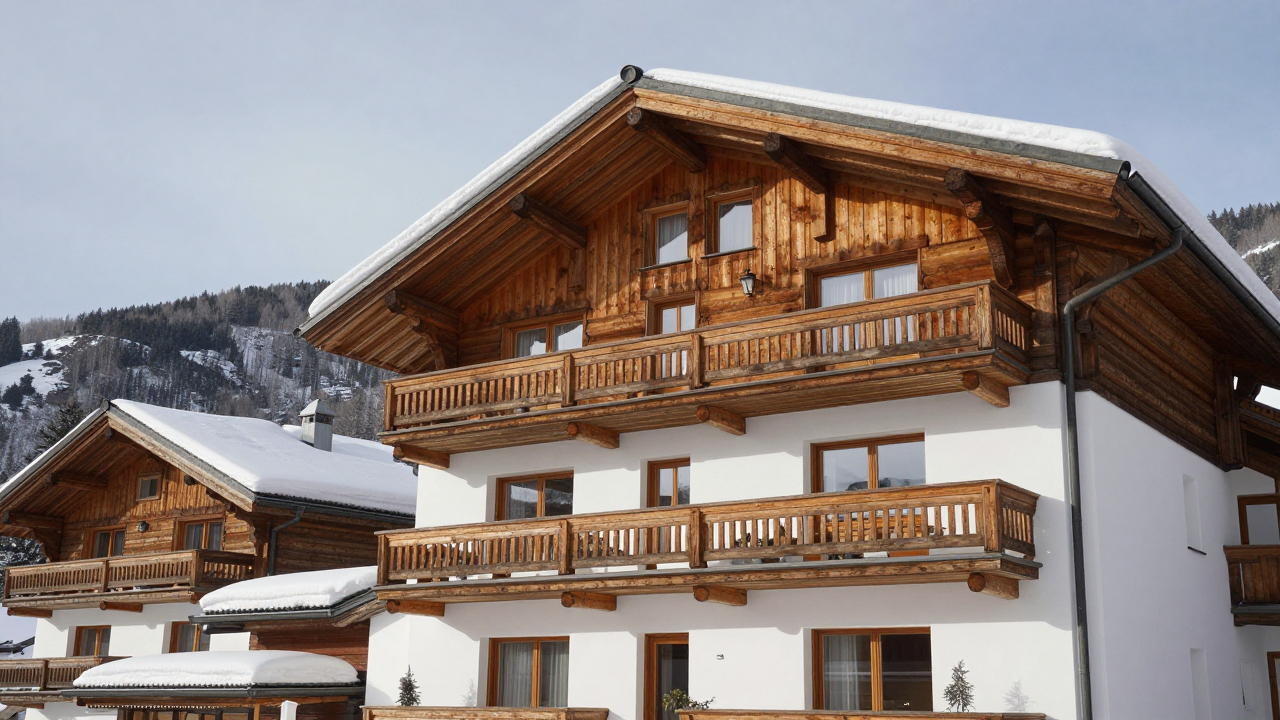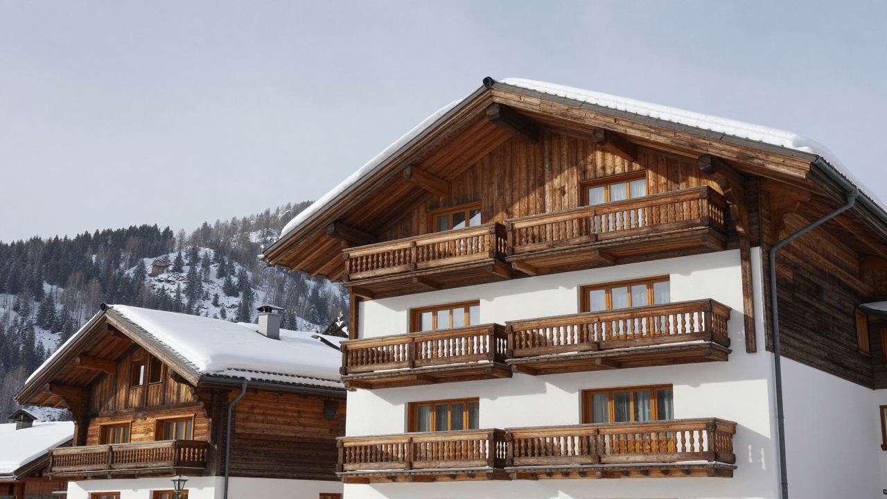 Горный отель‑шале с деревянными балконами, снег на крыше.