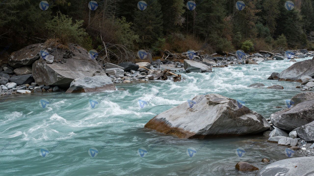 Горная река с бирюзовой водой, валуны, быстрина.