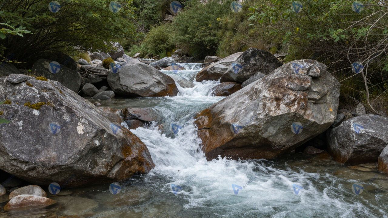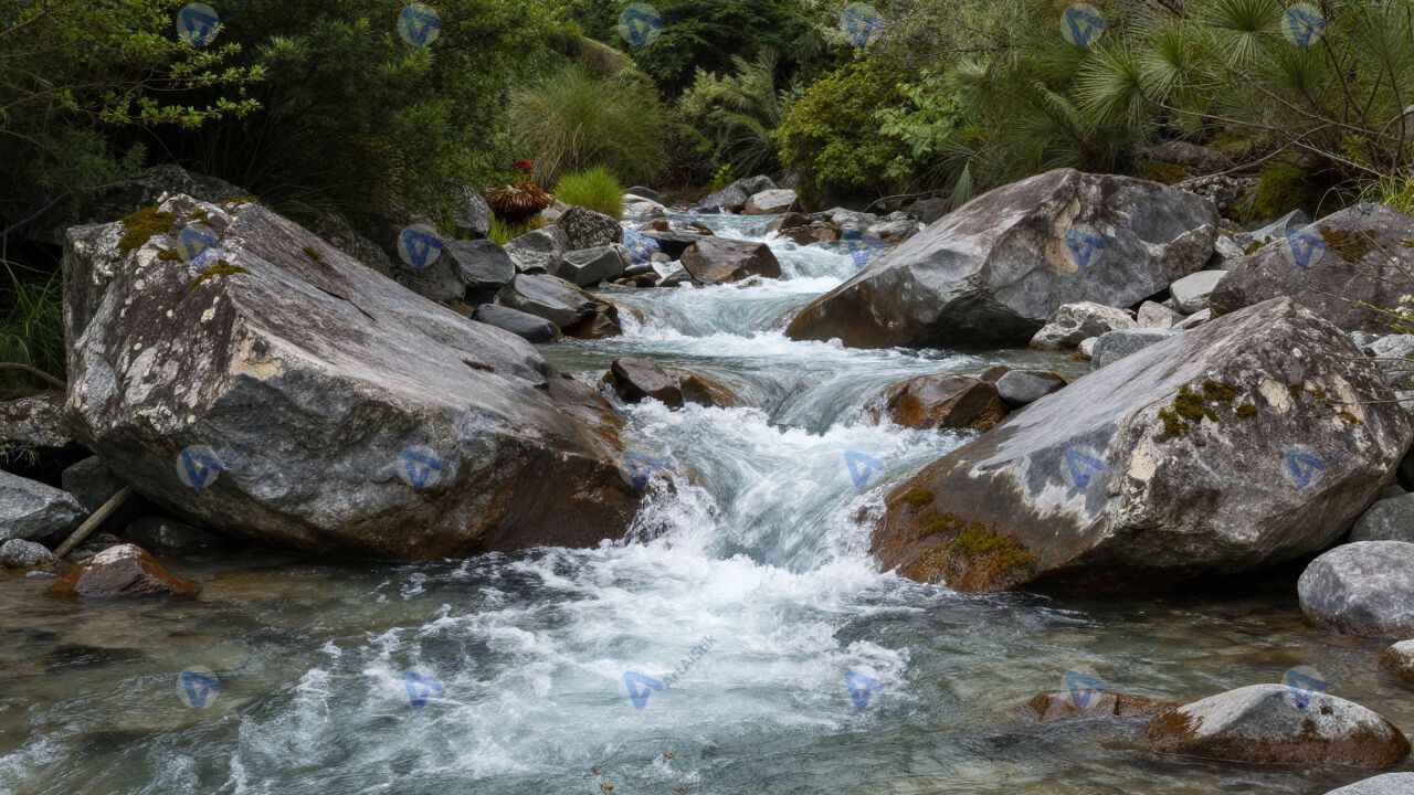 Горный ручей между валунами, белая вода, зелень.