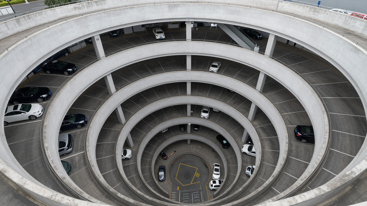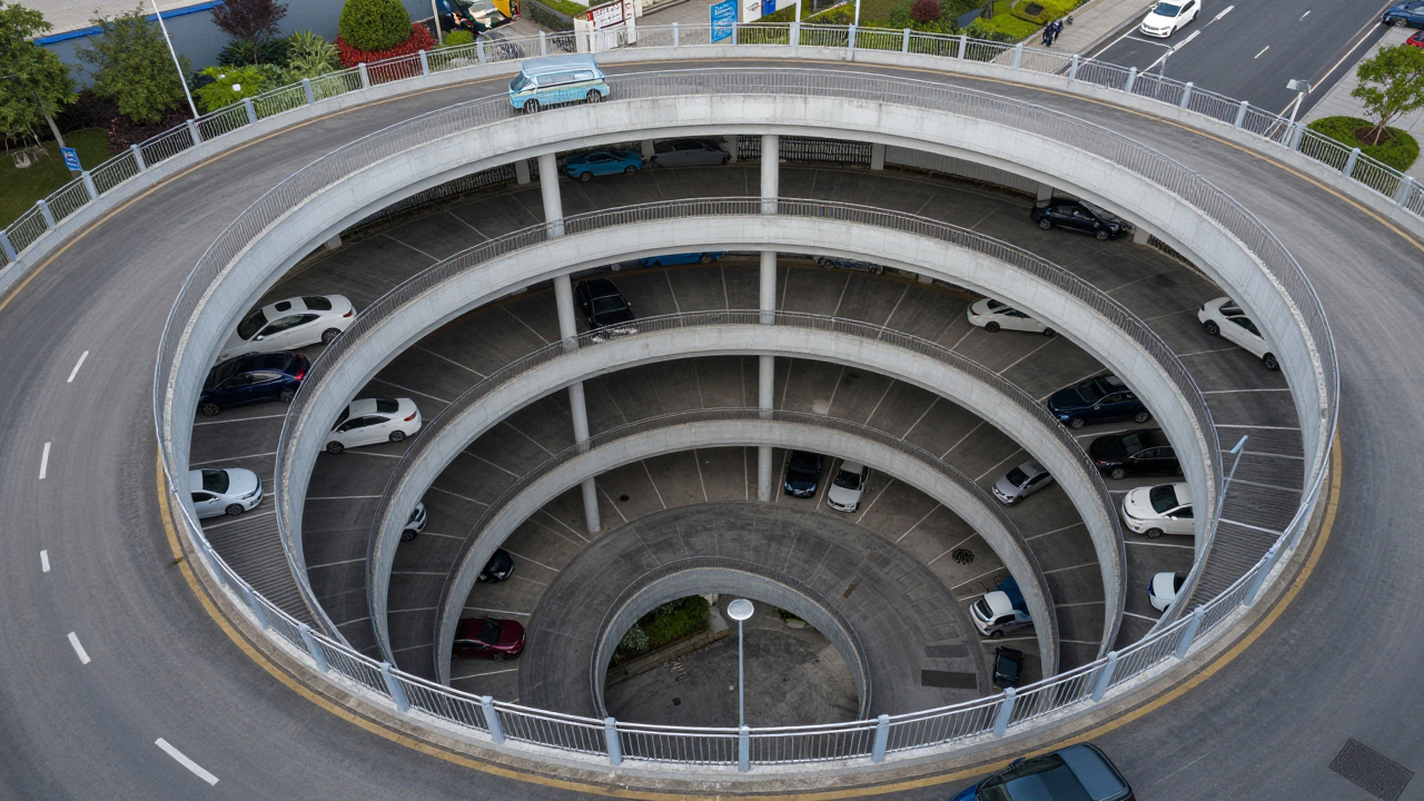 Многоуровневая автостоянка, спиральный съезд, вид сверху.
