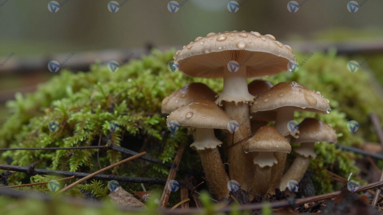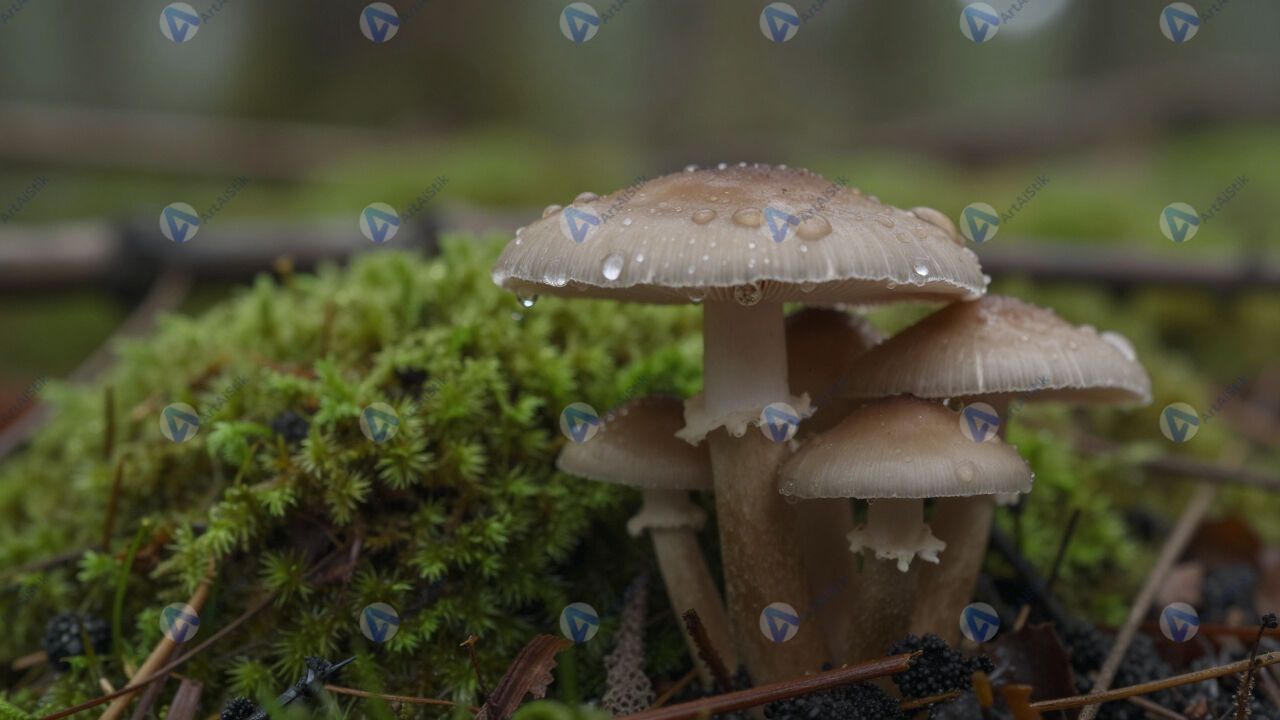 Грибы в лесной подстилке, мох, капли воды.
