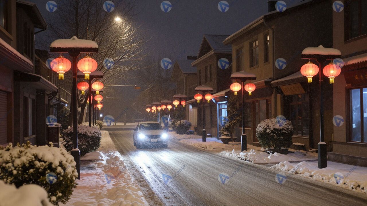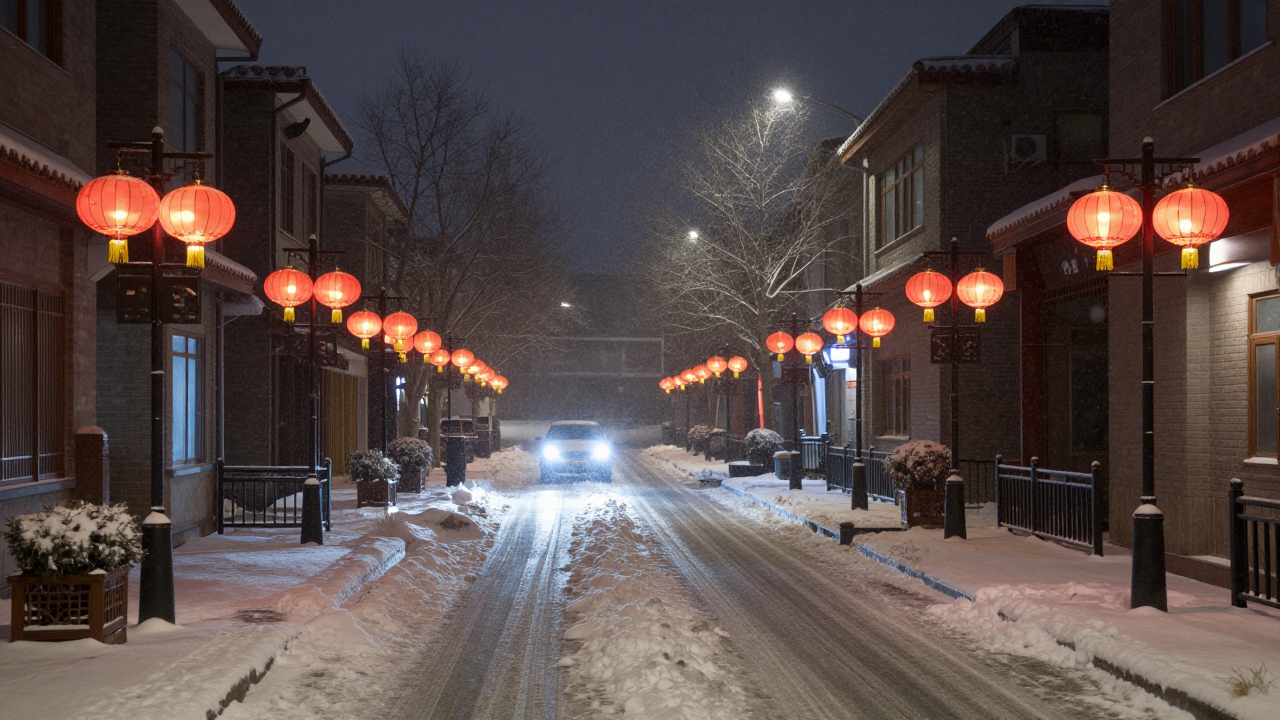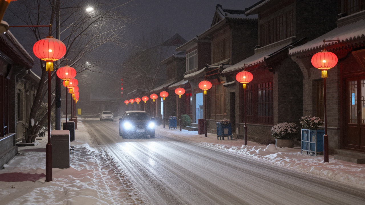 Ночная улица во время снегопада, фонари и свет фар.