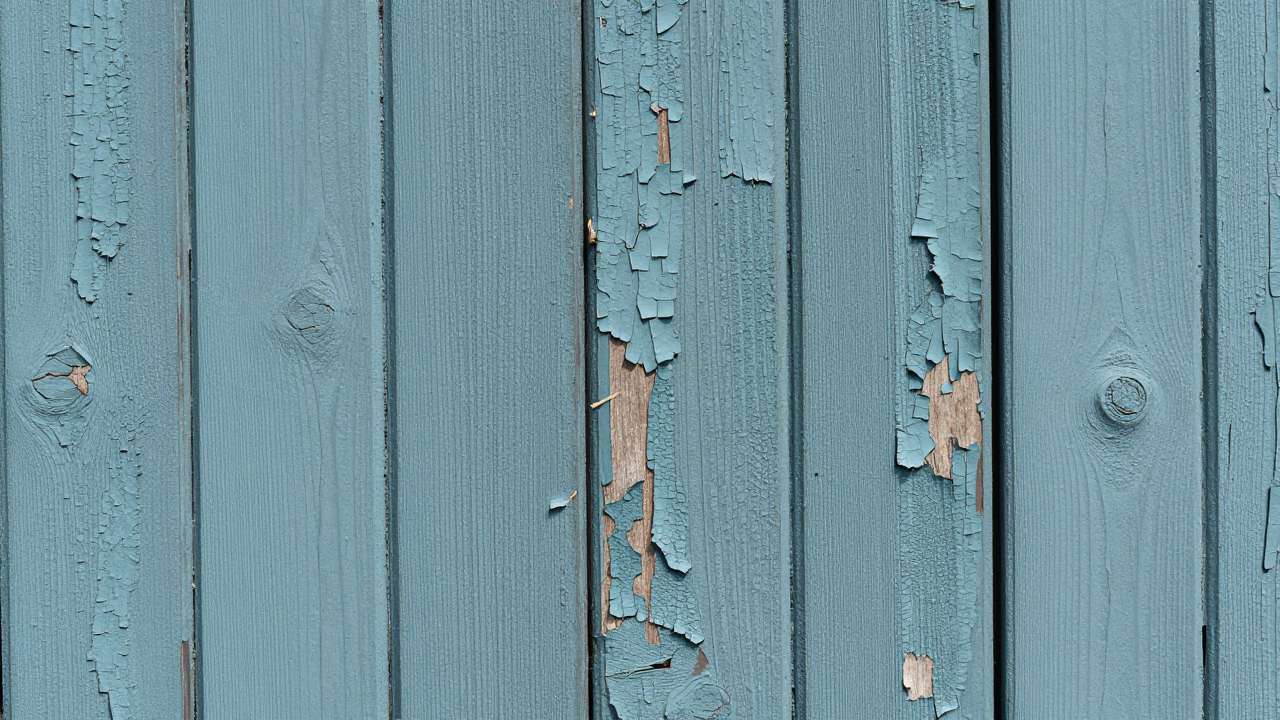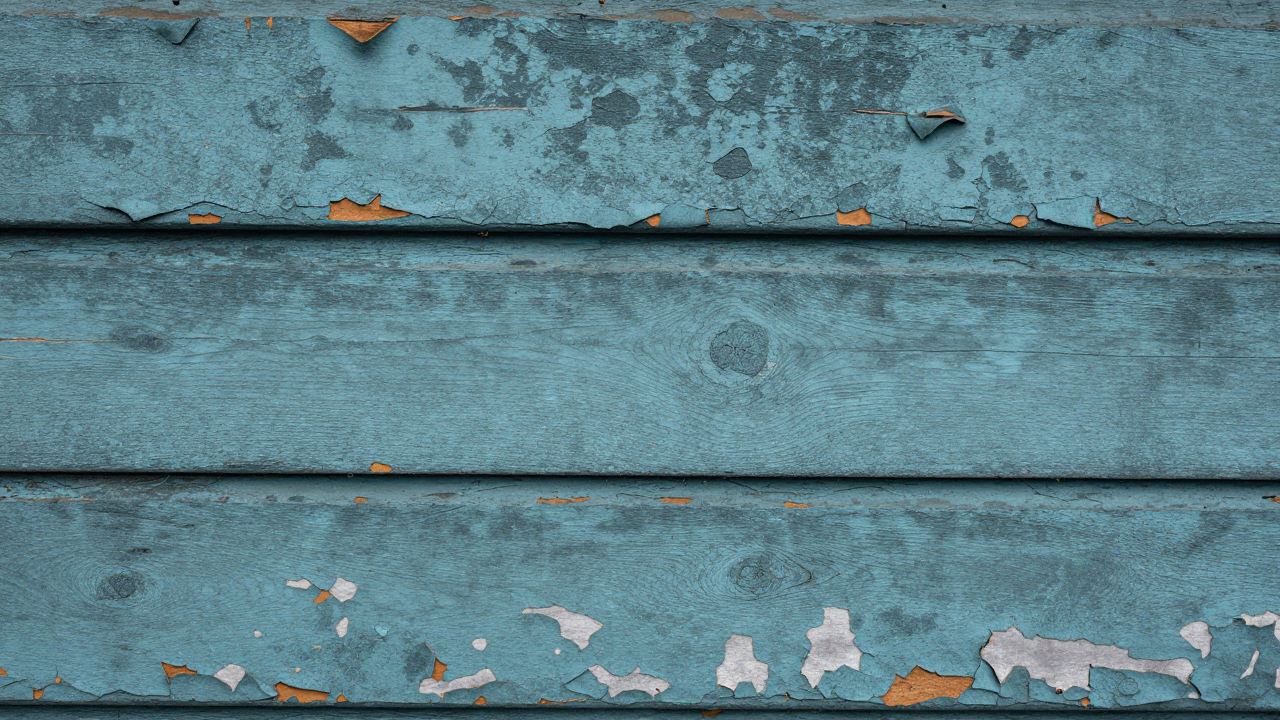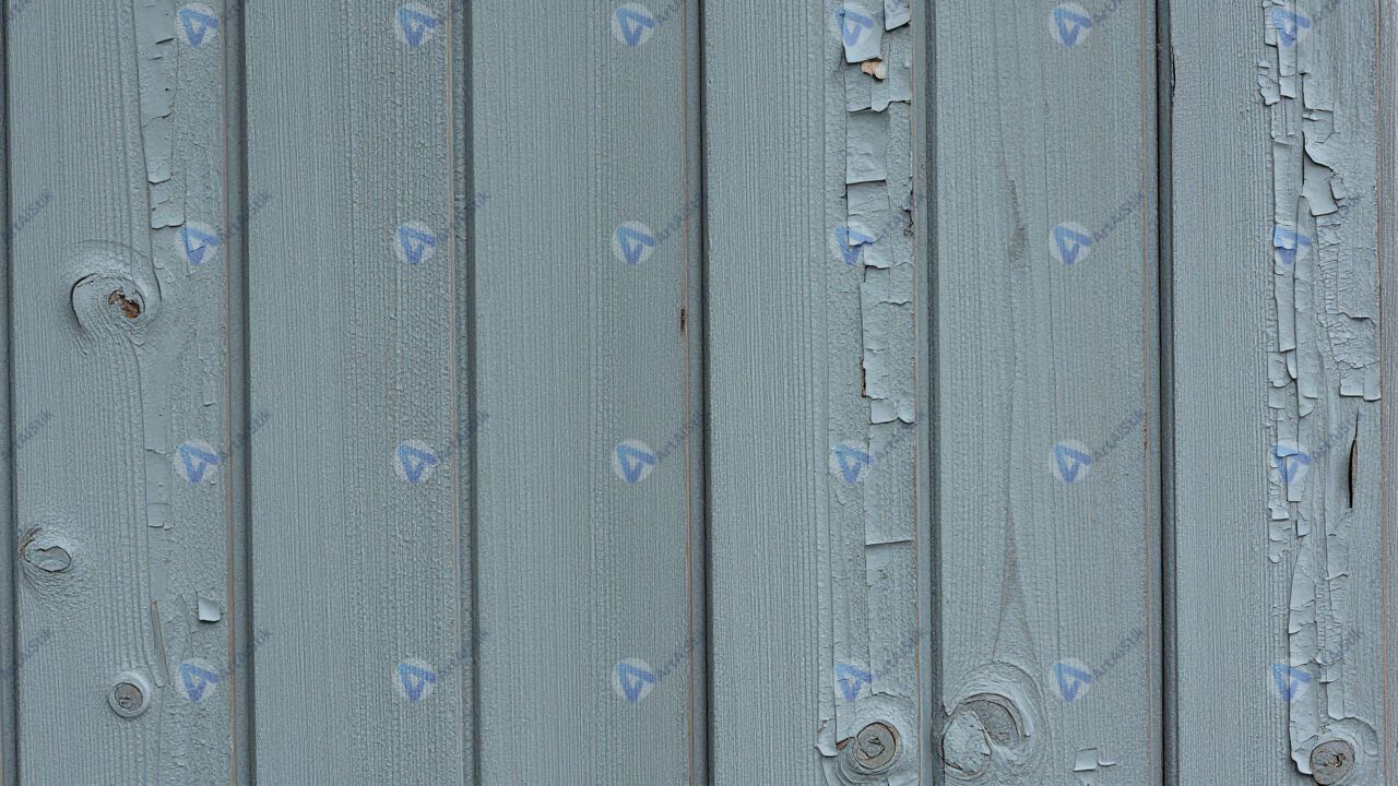 Старое облупившееся крашеное дерево, видны слои краски.