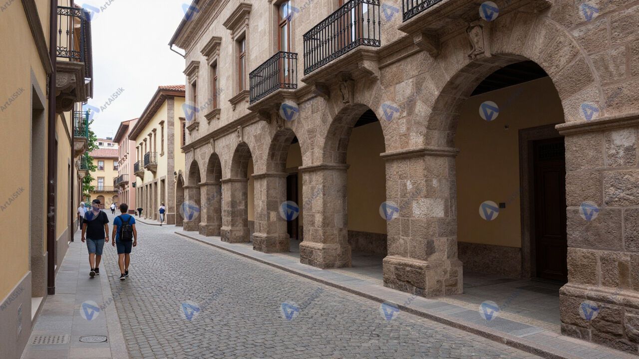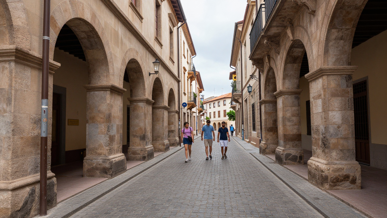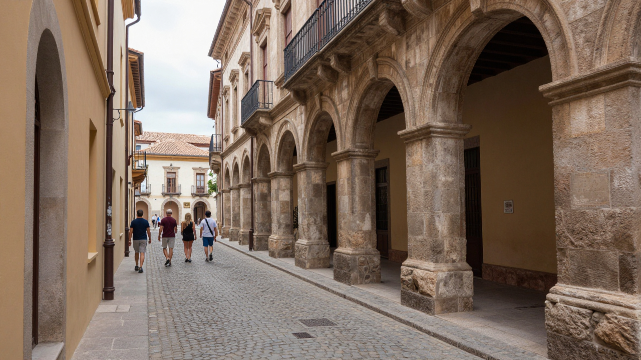 Улица старого города с брусчаткой и арками, туристы.