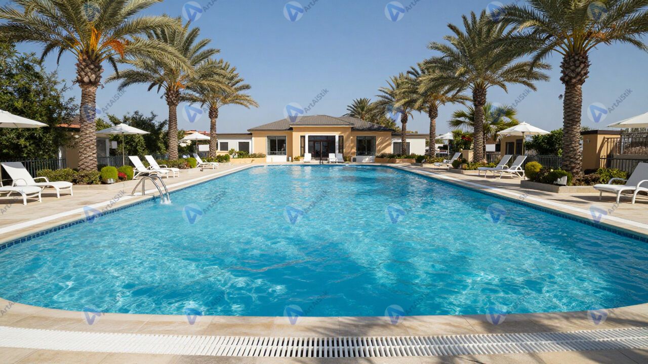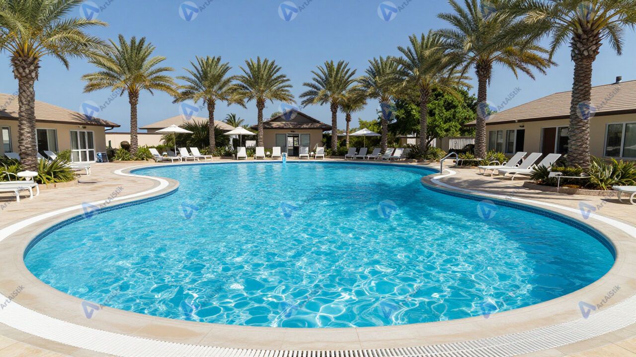 Бассейн под открытым небом, бирюзовая вода, пальмы, солнце.