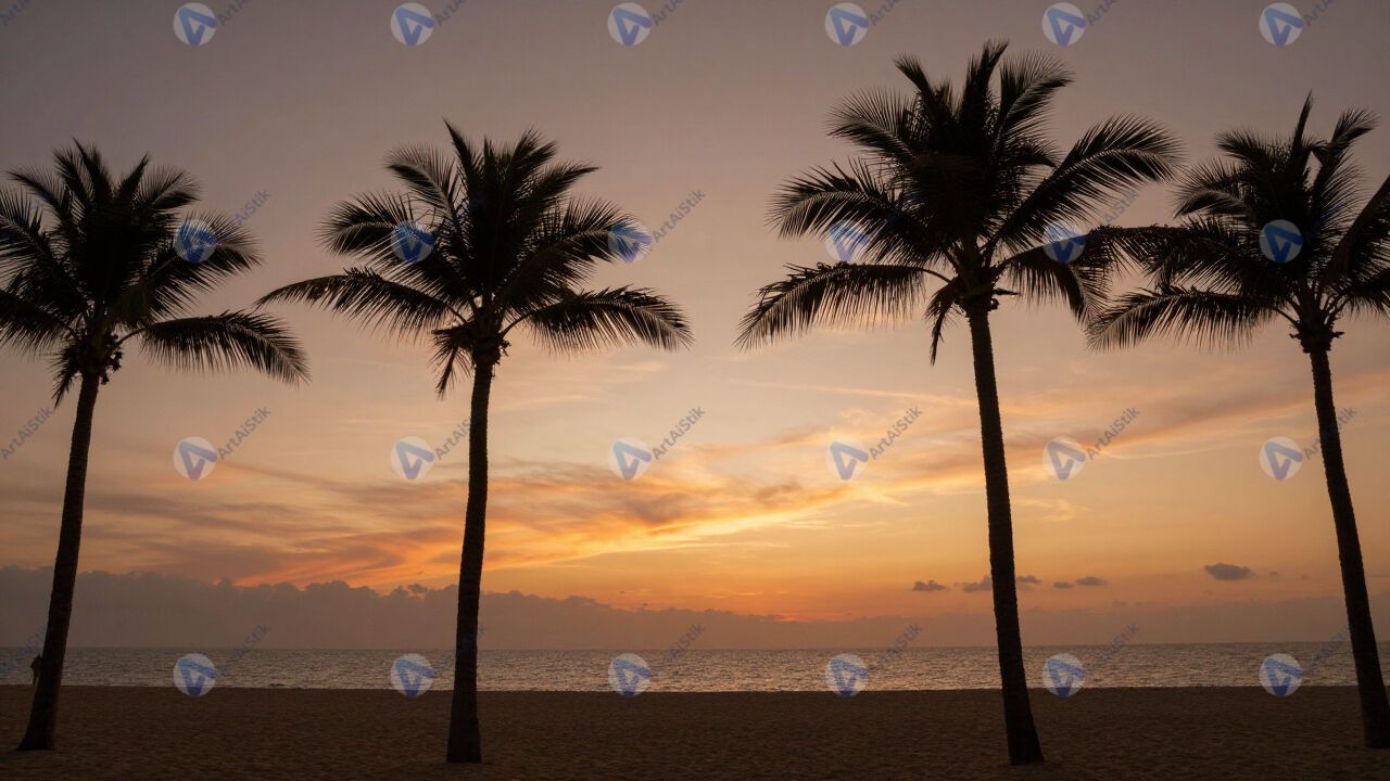 Пальмы на пляже на закате, силуэты, оранжевое небо.