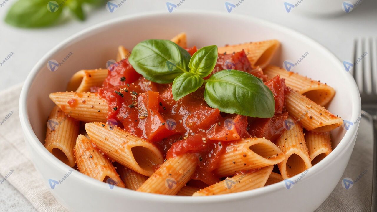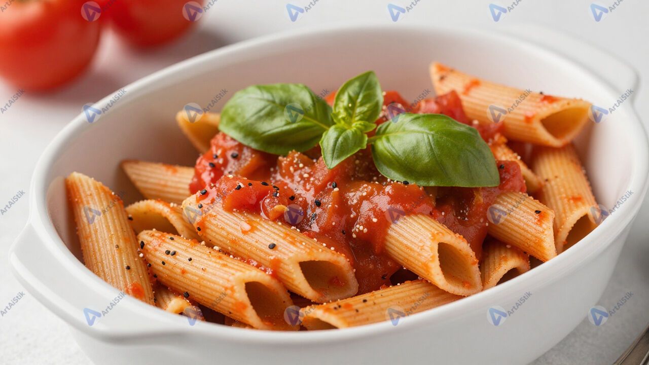 Паста с томатным соусом и базиликом в глубокой тарелке.