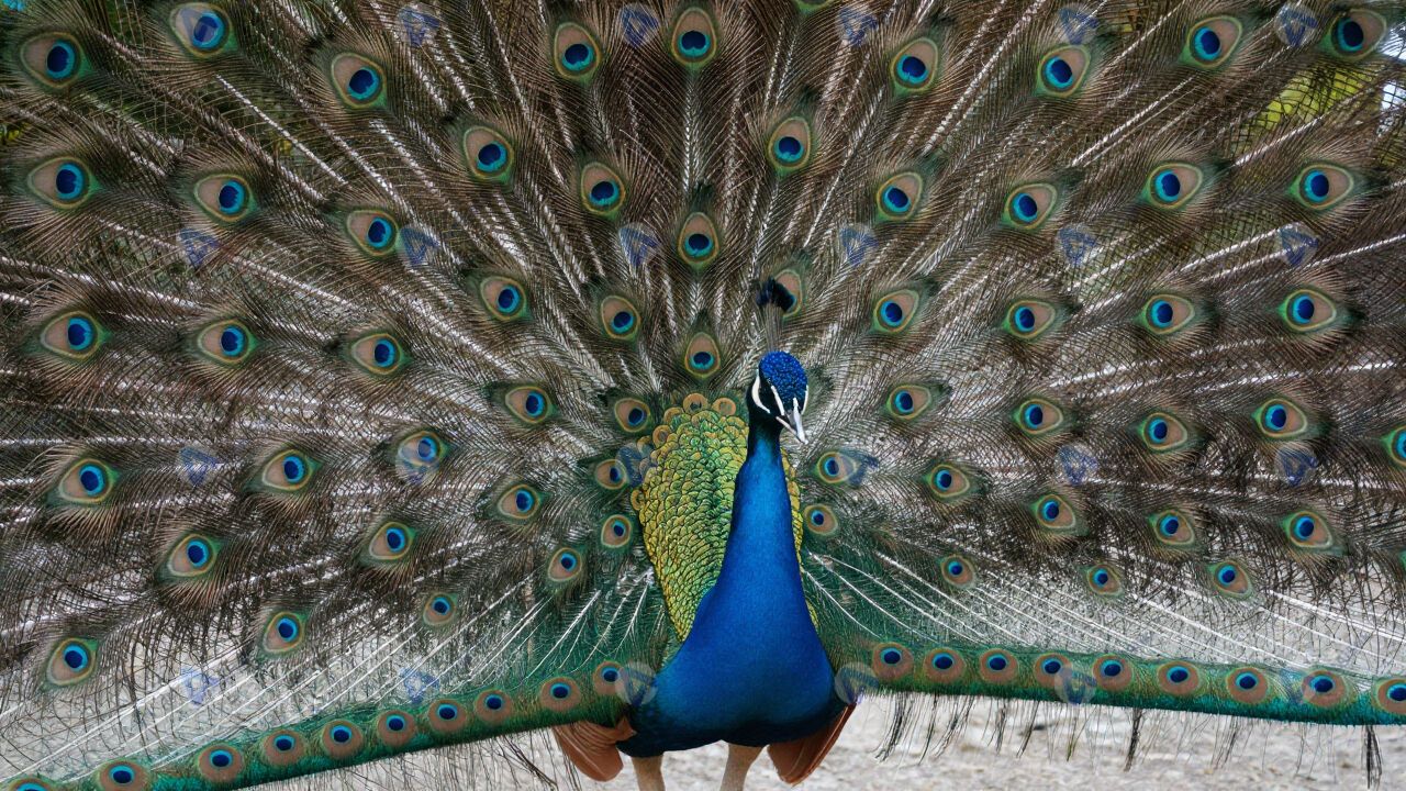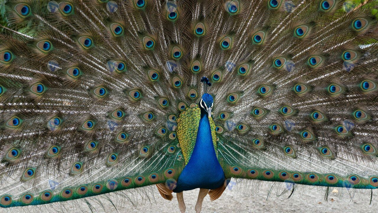 Павлин раскрыл хвост, перья, зелёно-синий, парк.