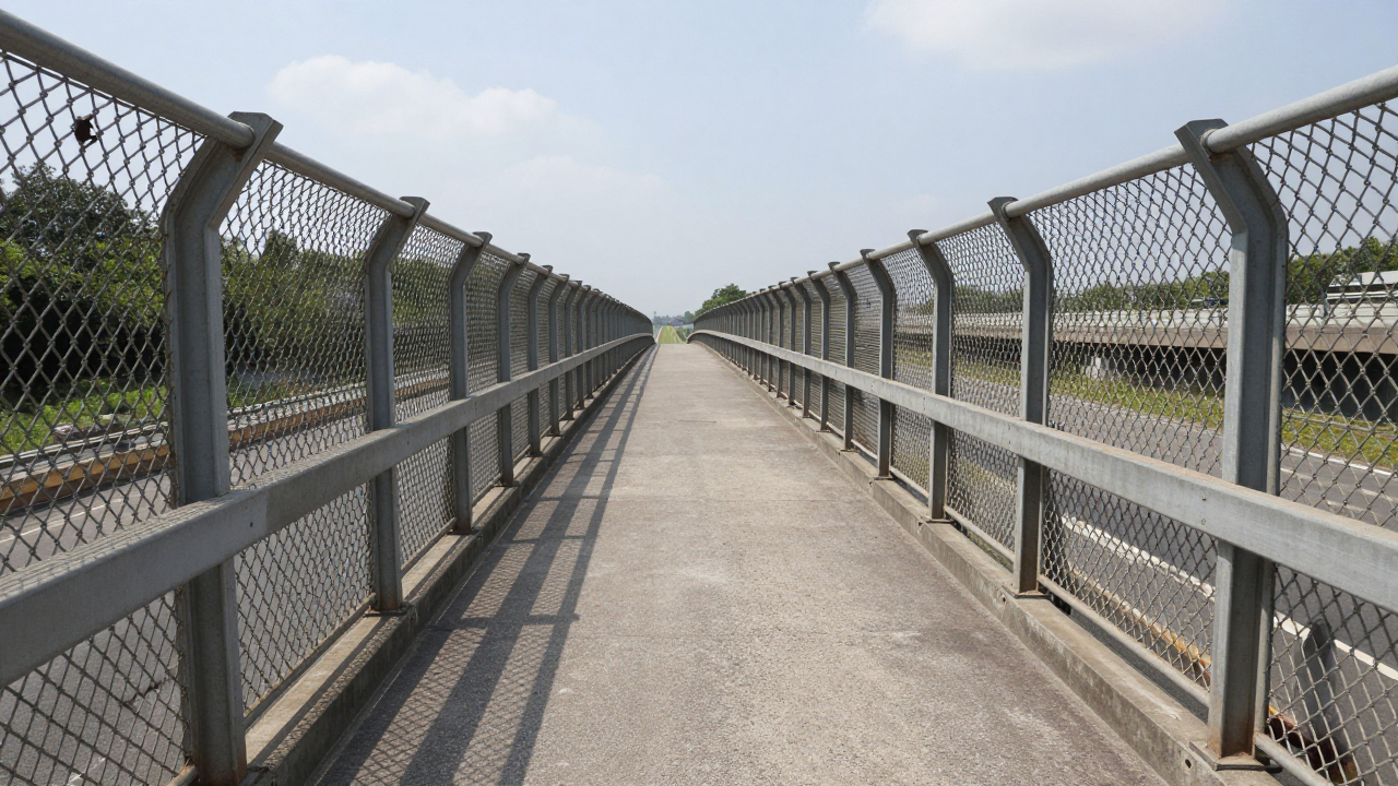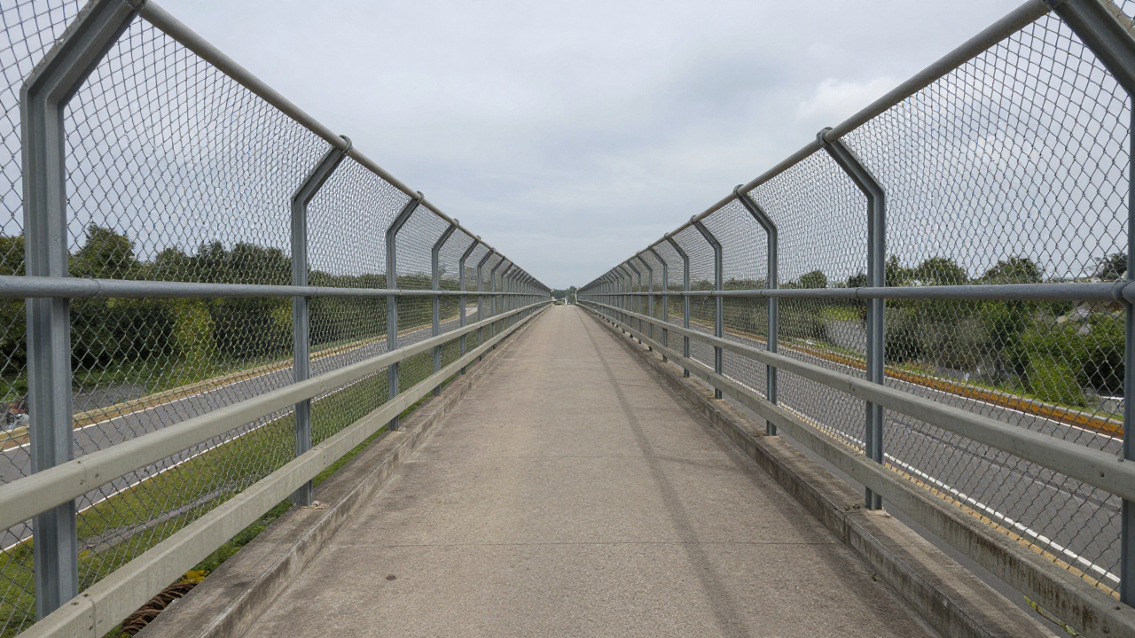 Пешеходный мост через шумную магистраль, решётчатые ограждения.