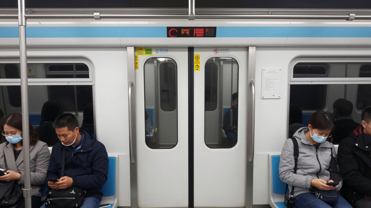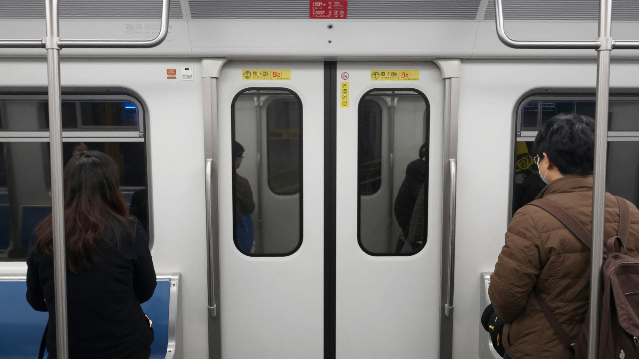 Люди заходят в поезд метро, двери вот‑вот закроются.
