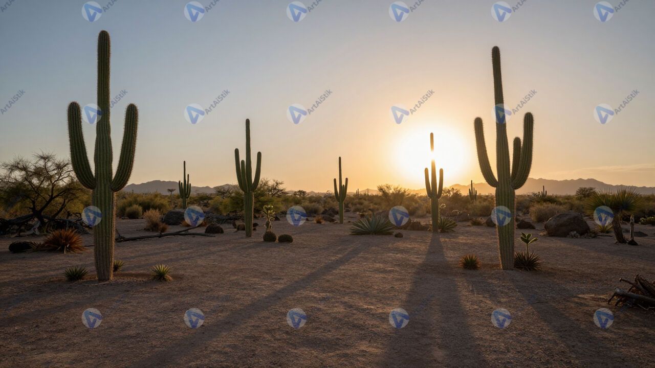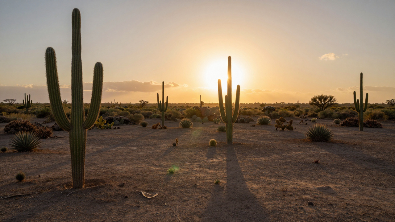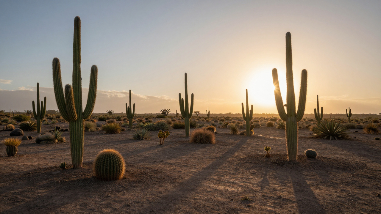 Плато с кактусами, закат, длинные тени.