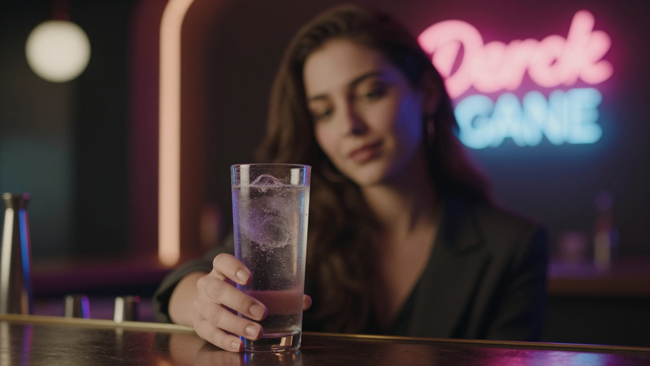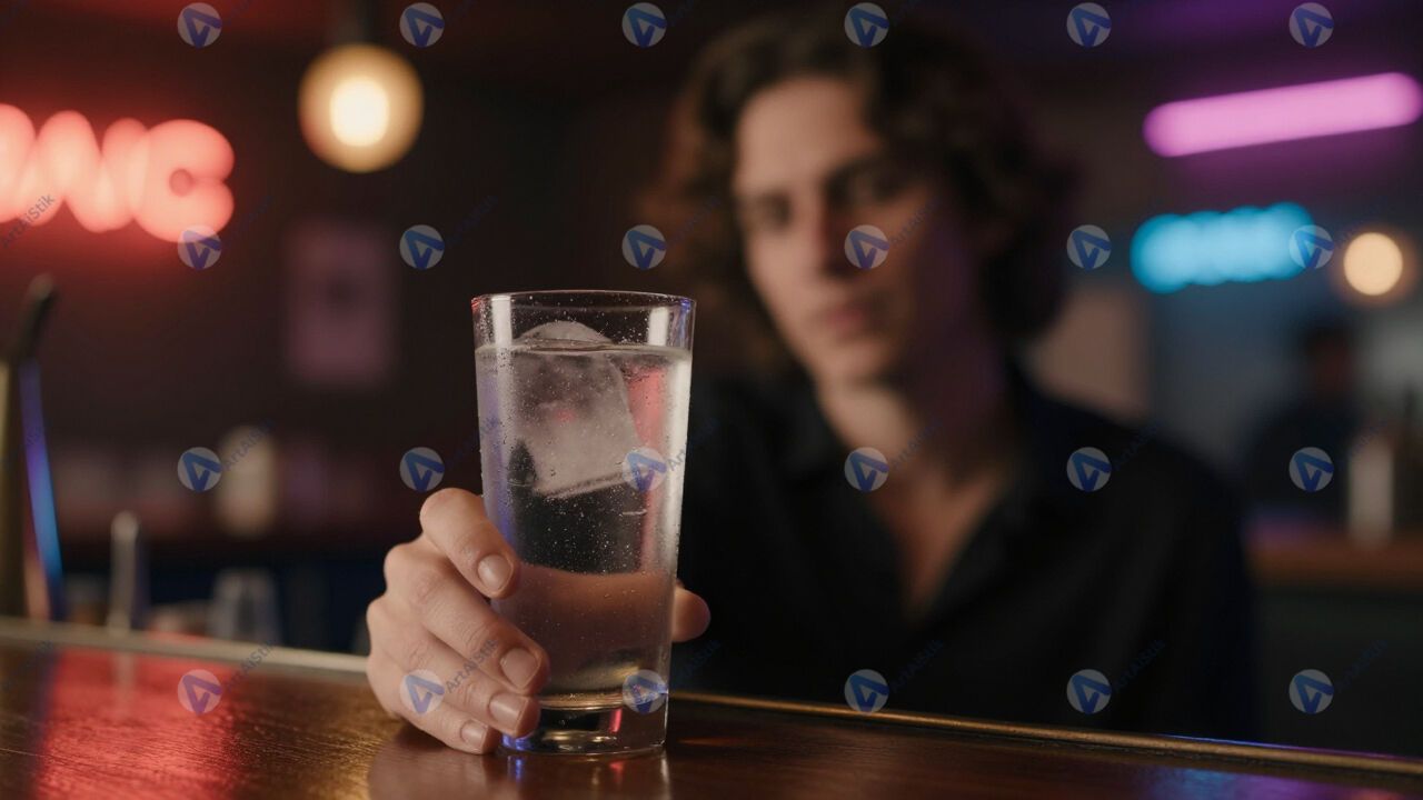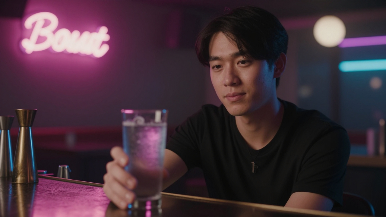 Портрет в баре, бокал, неон, ночь.