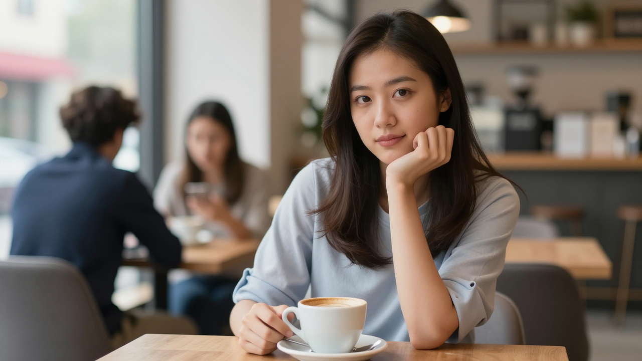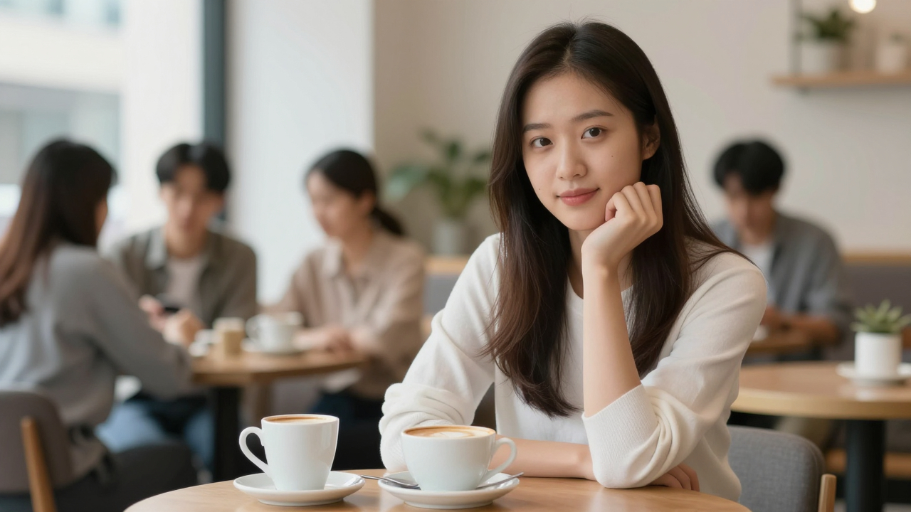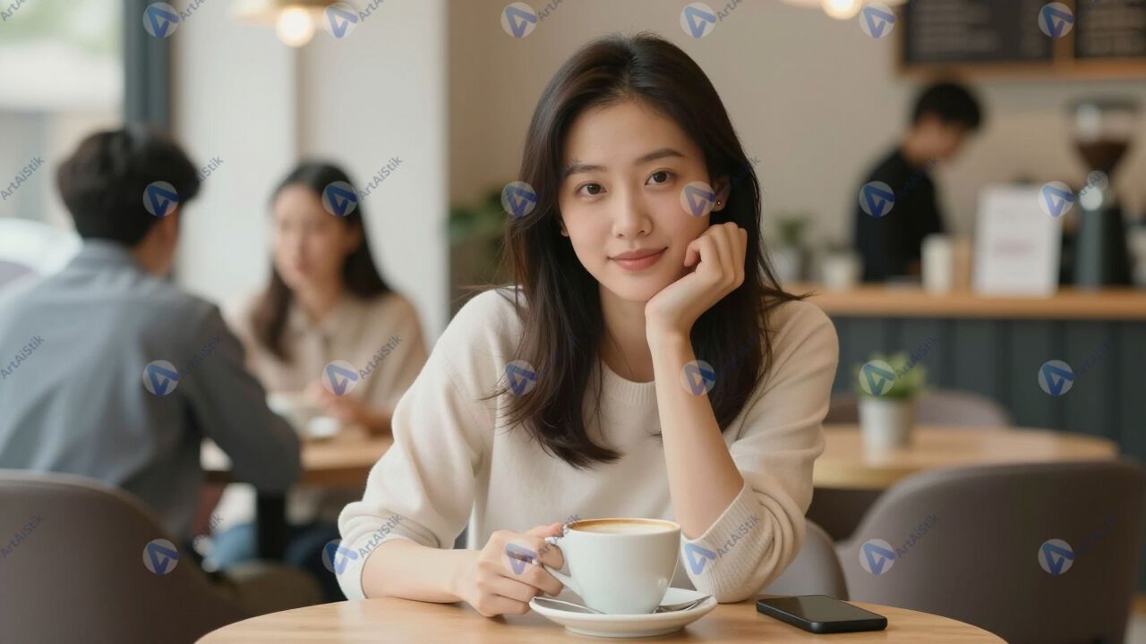 Портрет в кафе за столиком, кофе, размытые гости.