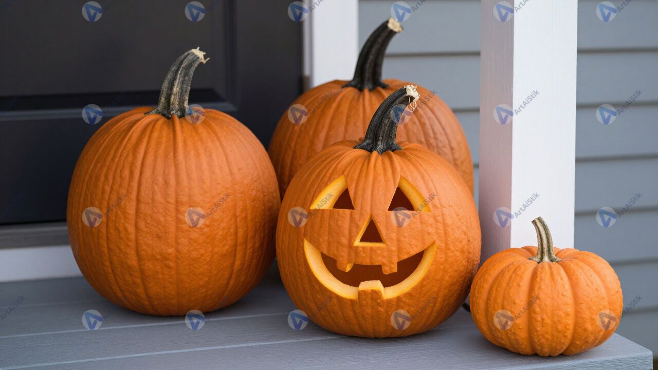 Тыквы осенью у крыльца, оранжевые, хеллоуин.
