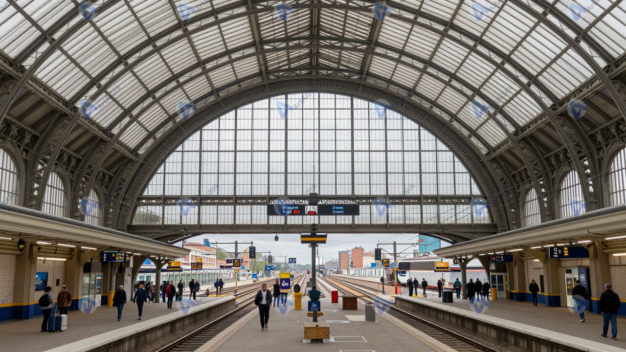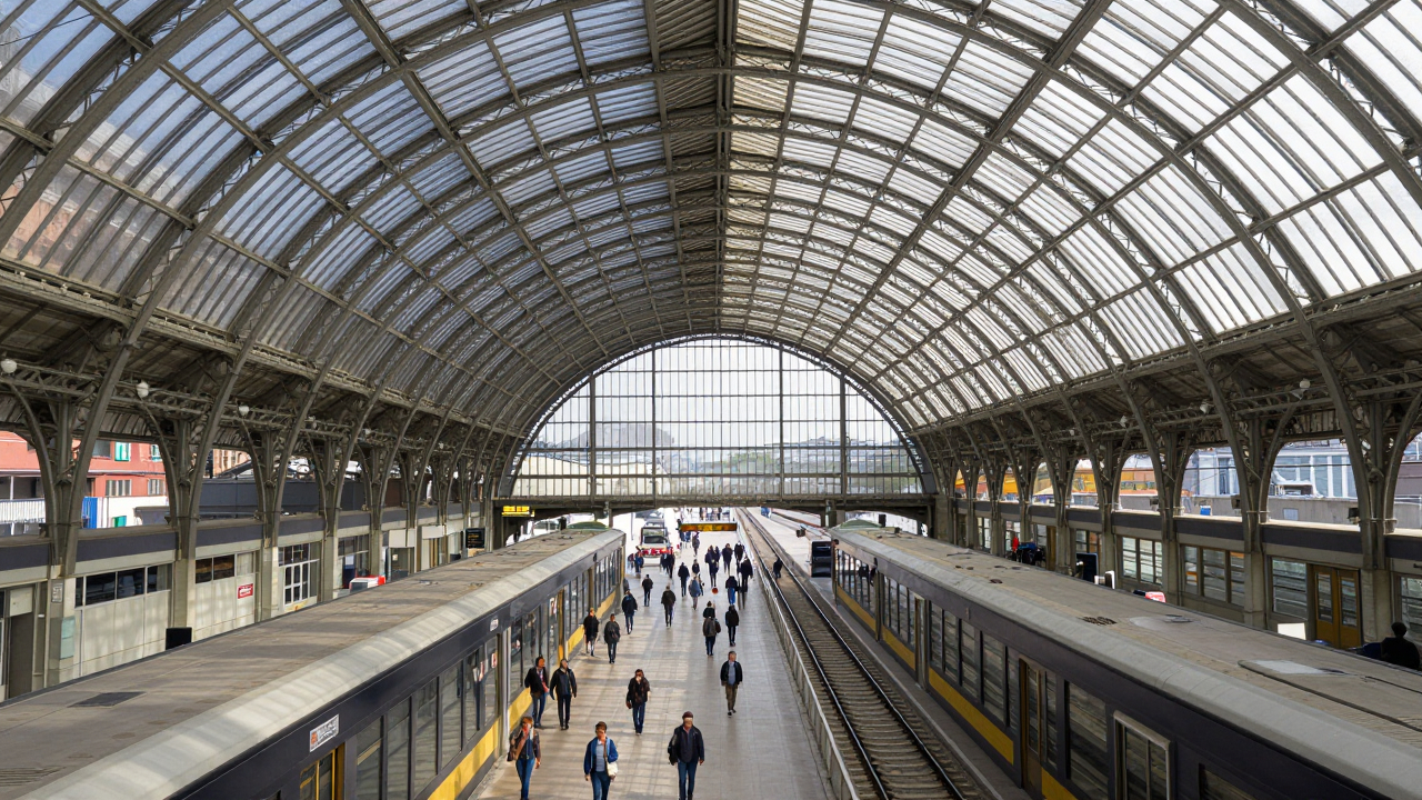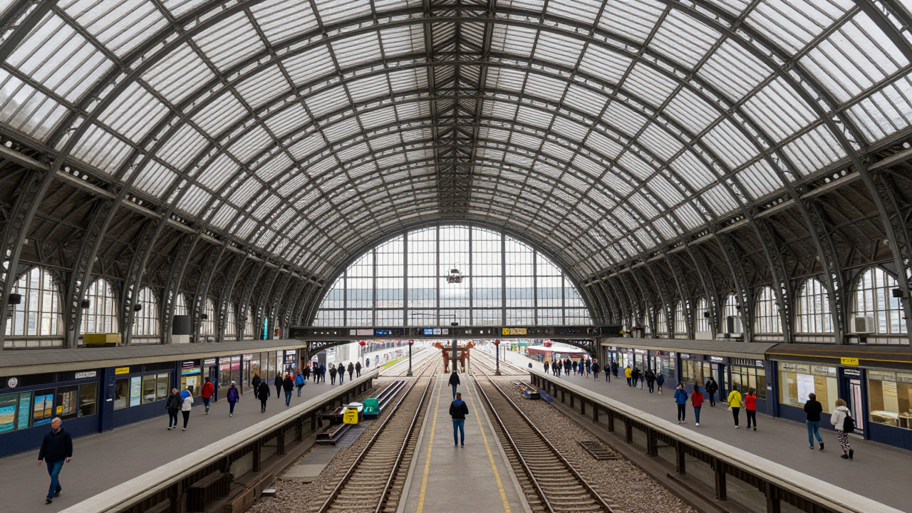 Железнодорожный вокзал с высоким стеклянным куполом, люди внизу.