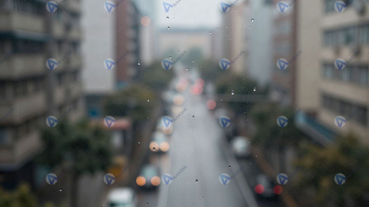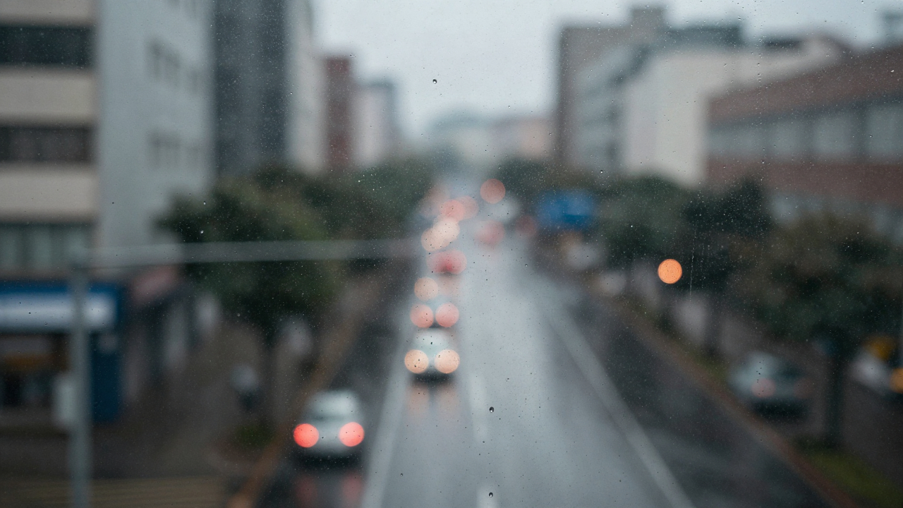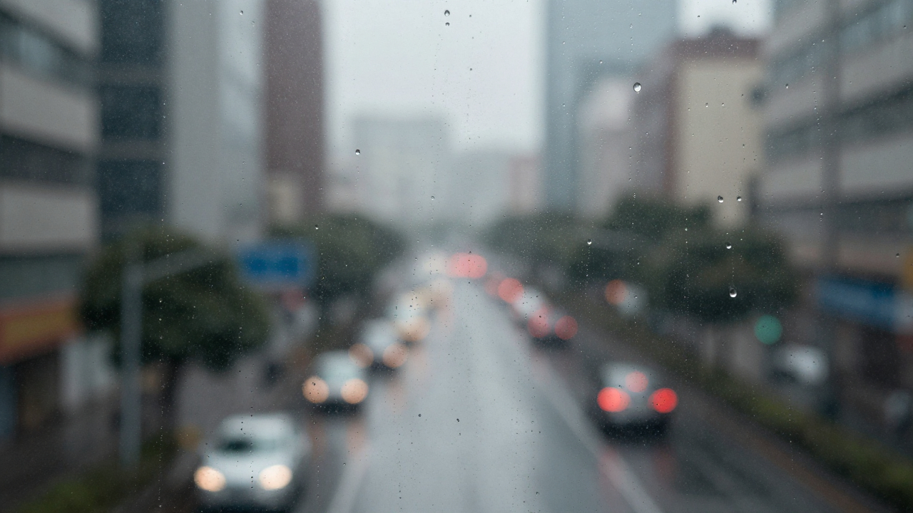 Дождь за окном, капли на стекле, размытый город.