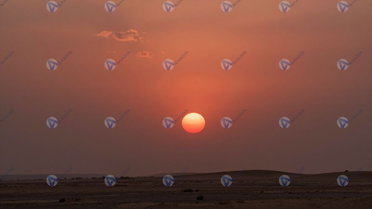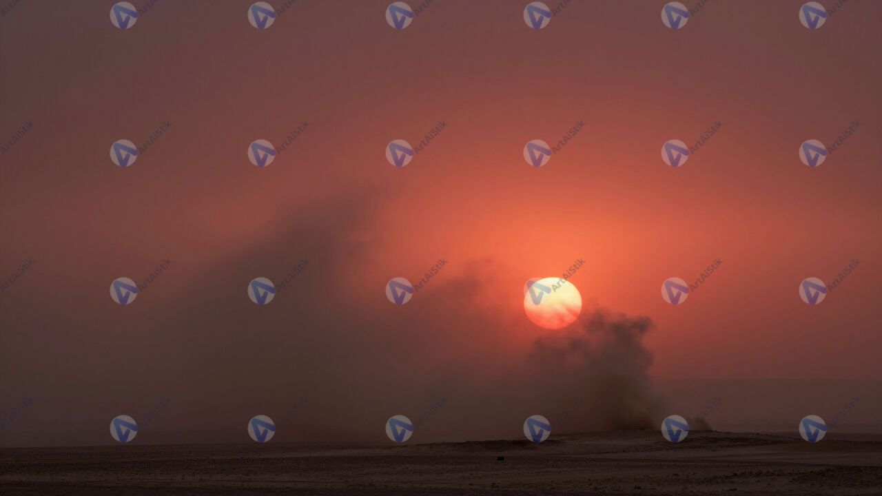 Красный закат после песчаной бури, пыль в воздухе.
