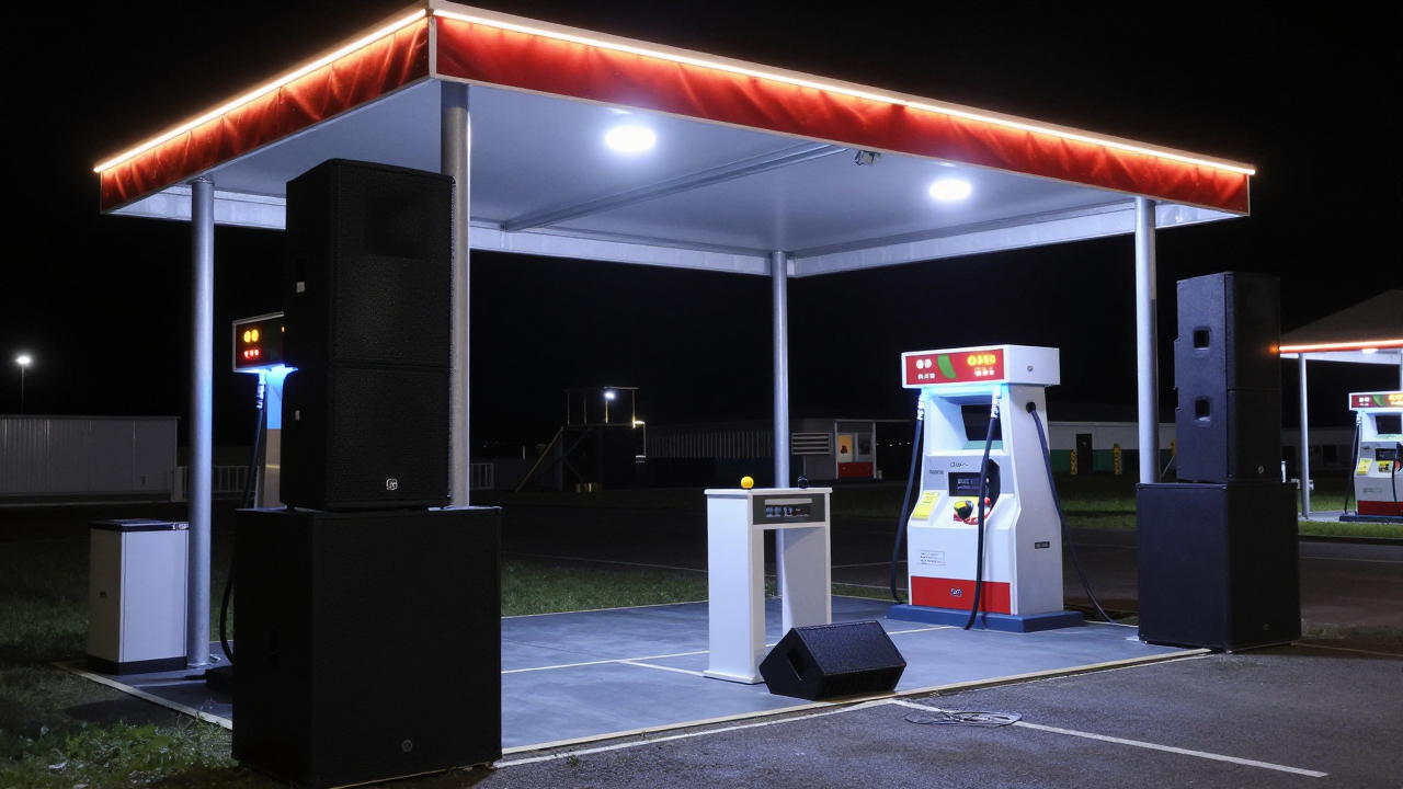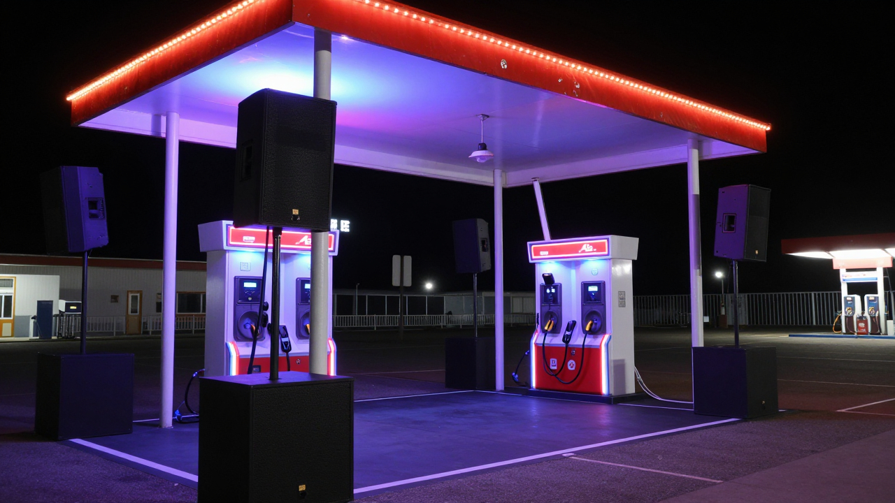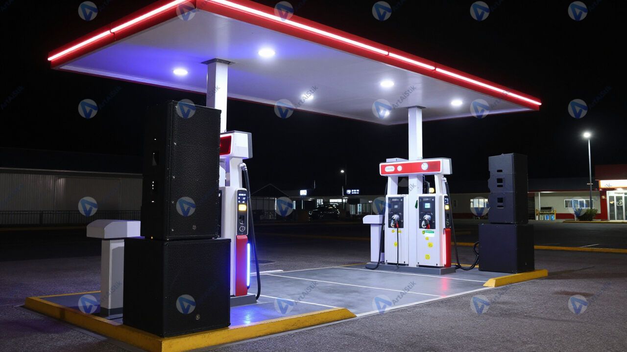 Заправка ночью, неоновая подсветка колонок и навеса.