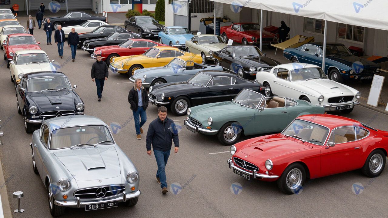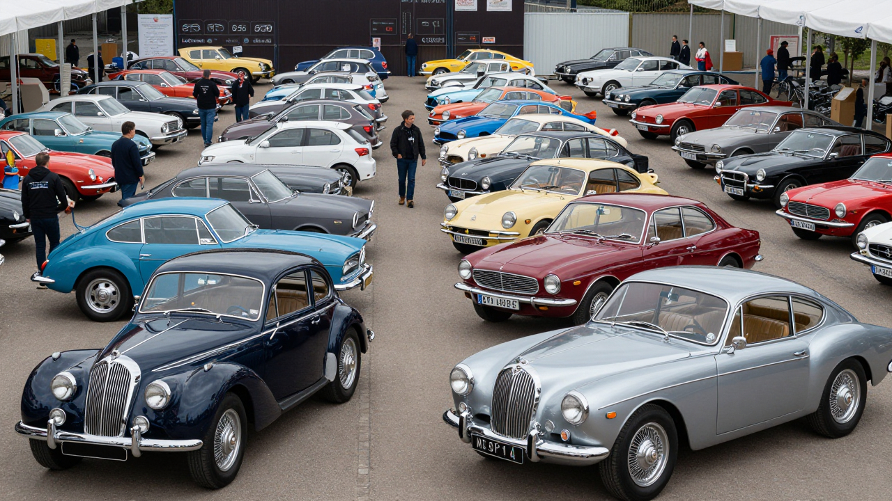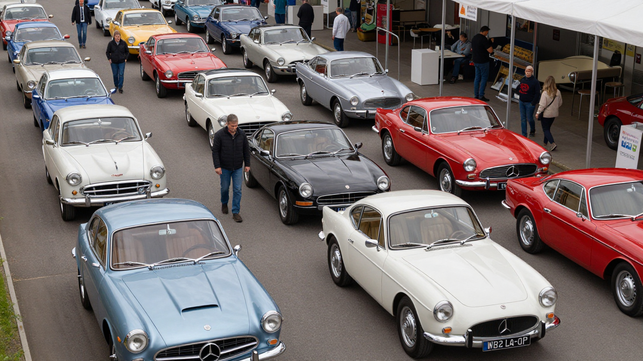 Ретро‑автомобили на выставке, люди ходят между рядами.