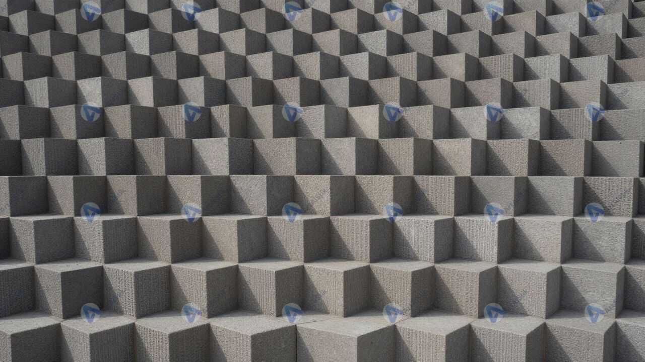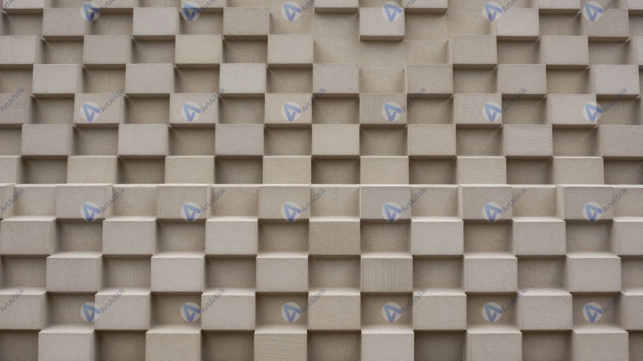 Ряды параллелепипедов образуют ступенчатую геометрическую стену.