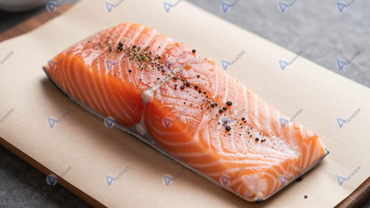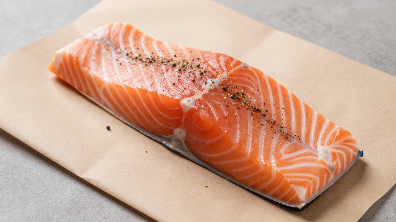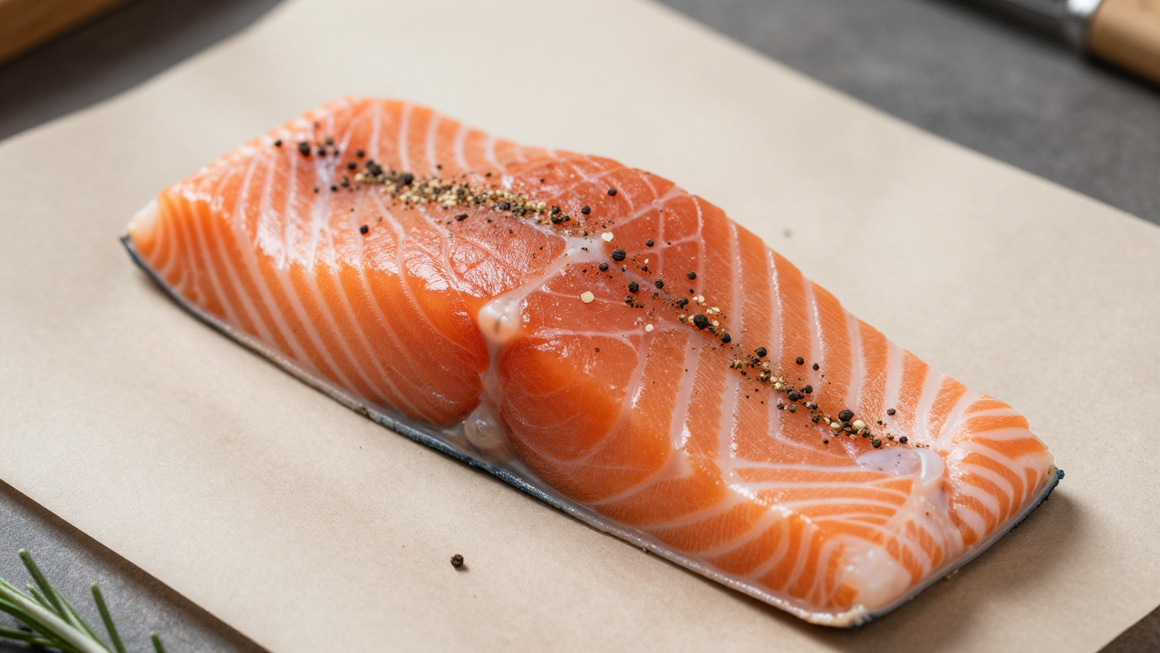 Филе лосося на бумаге, посыпанное специями.