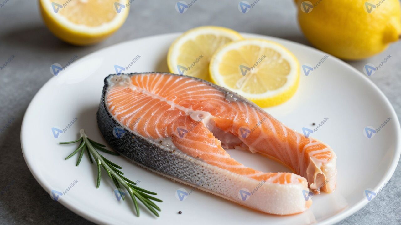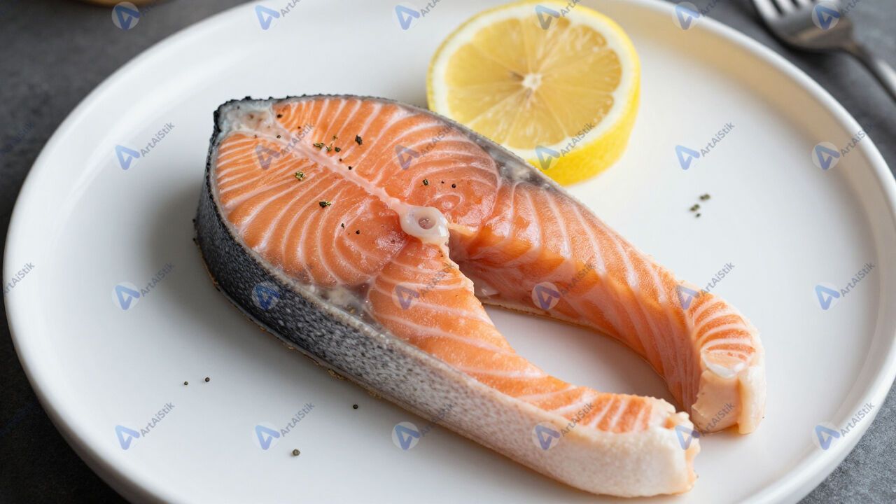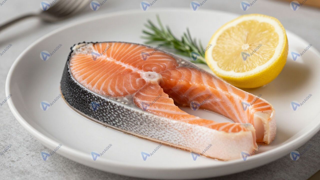 Стейк из лосося на тарелке с лимоном и зеленью.