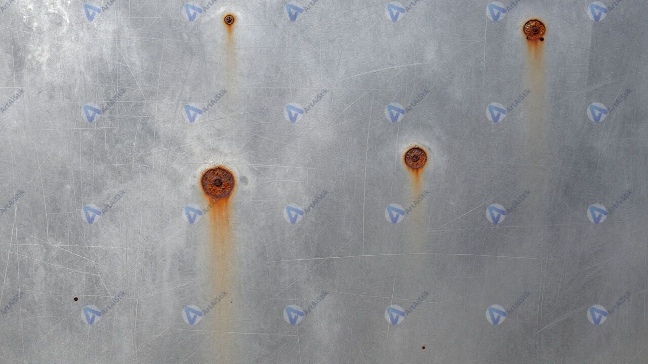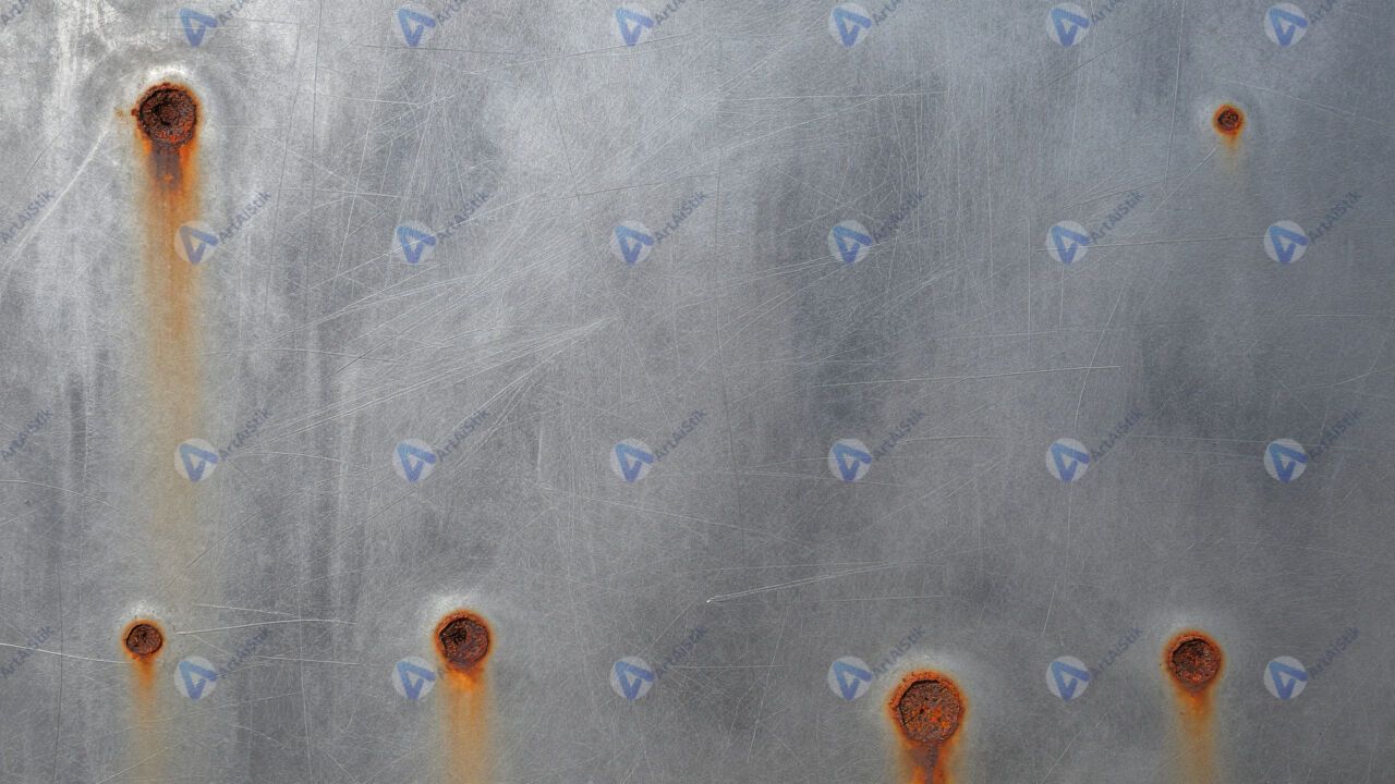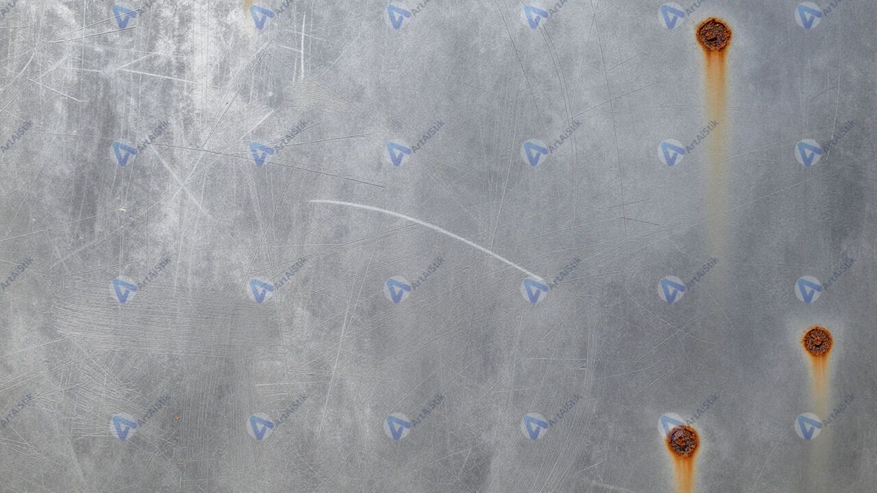Царапаный металл с ржавыми пятнами.