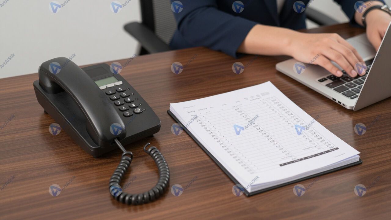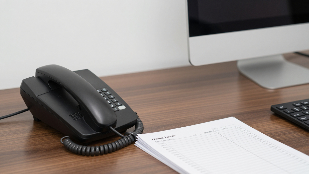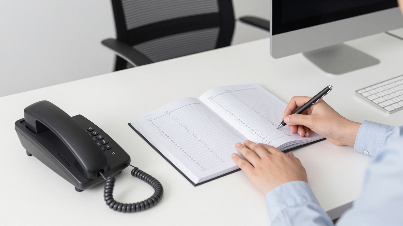 Стол секретаря, телефон, журнал звонков и компьютер.