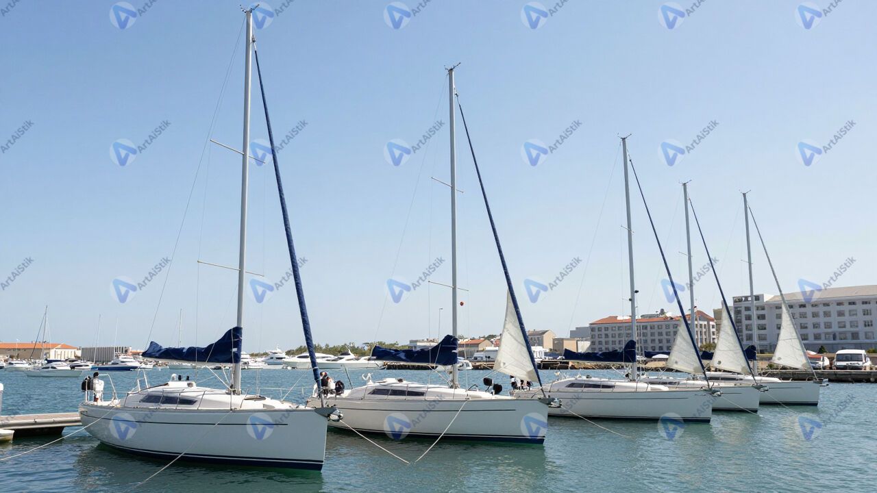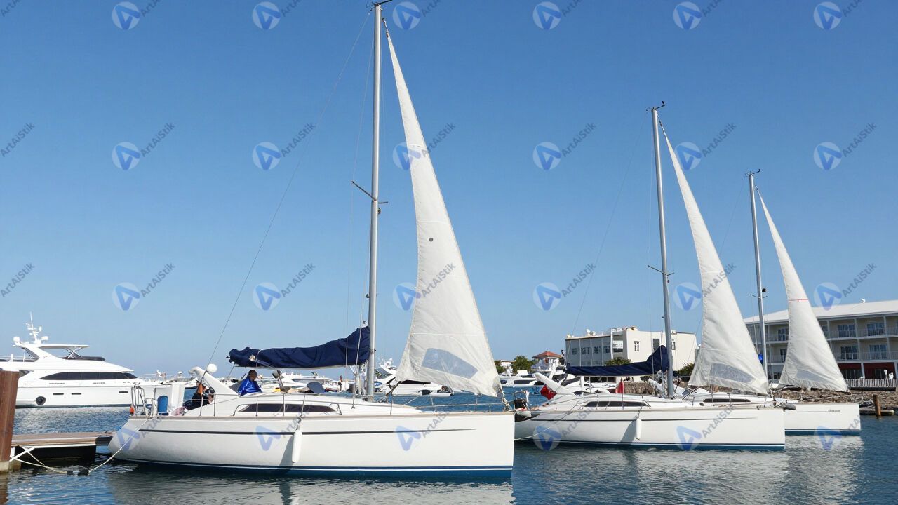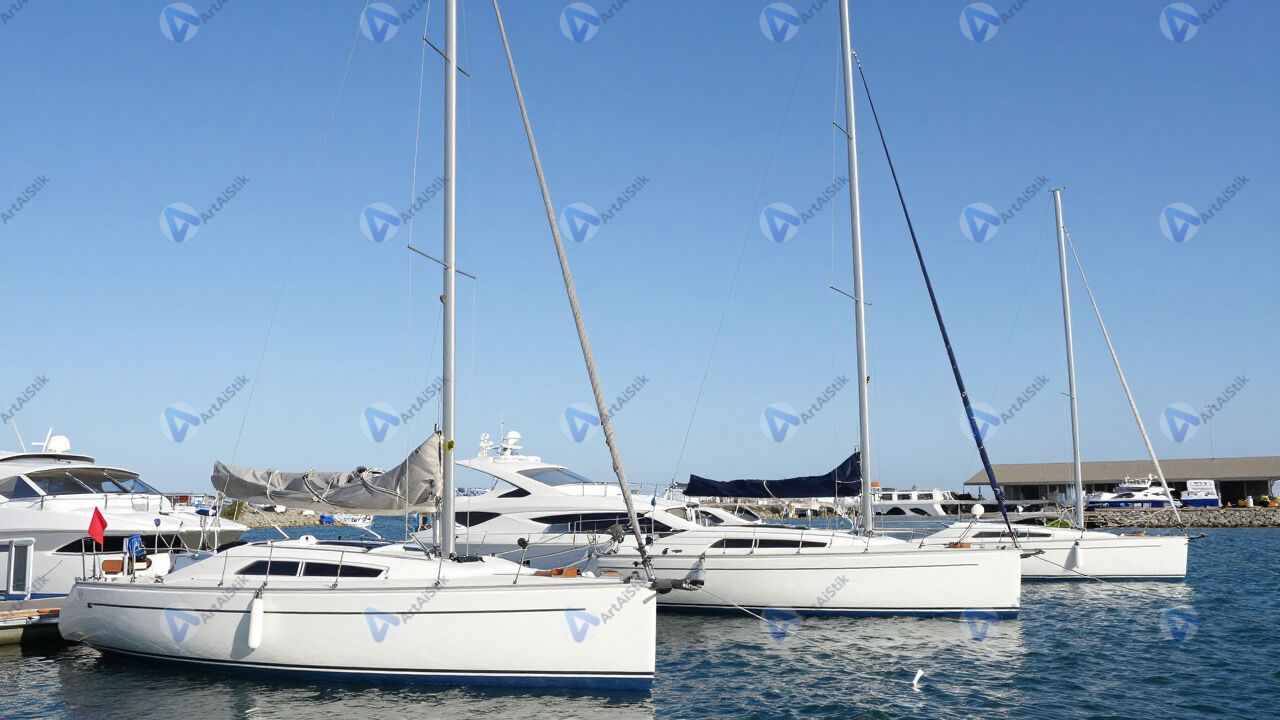 Несколько яхт с опущенными парусами стоят в марине.