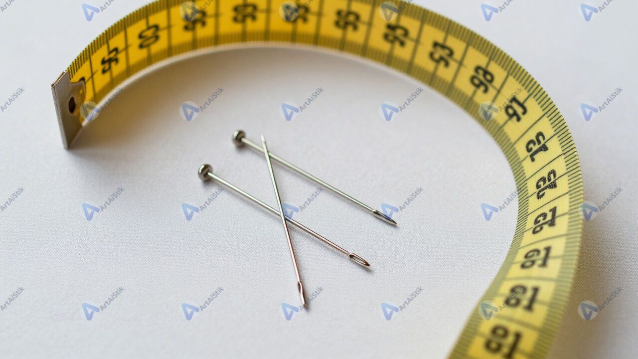 Швейные булавки и сантиметровая лента на разложенной ткани.