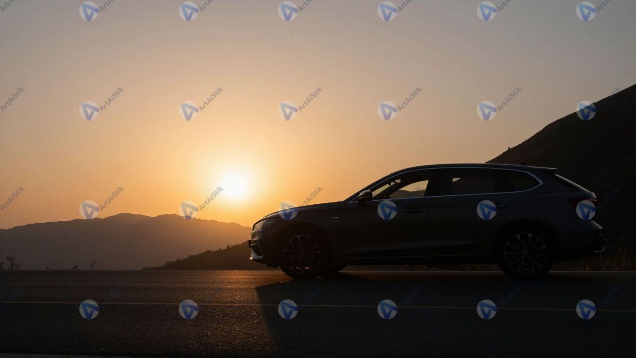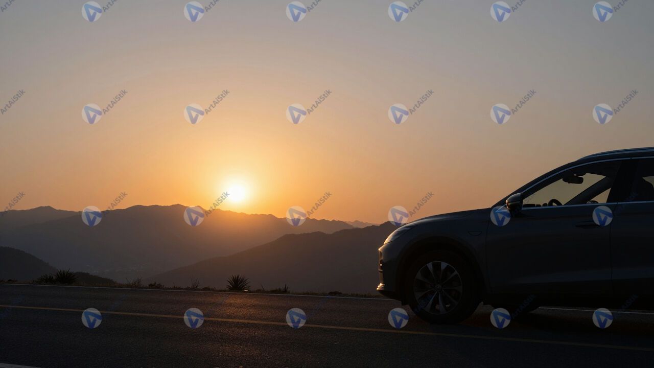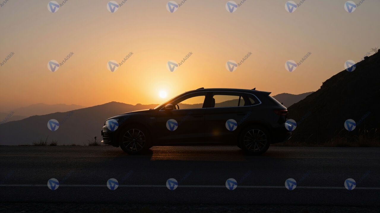 Силуэт автомобиля на горной дороге на фоне заката.