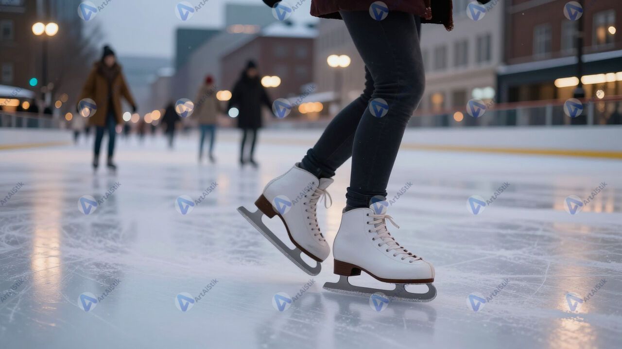 Каток зимой, коньки, вечерние огни, город.
