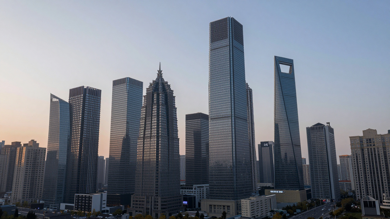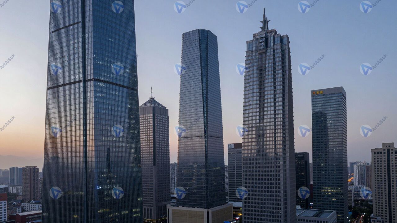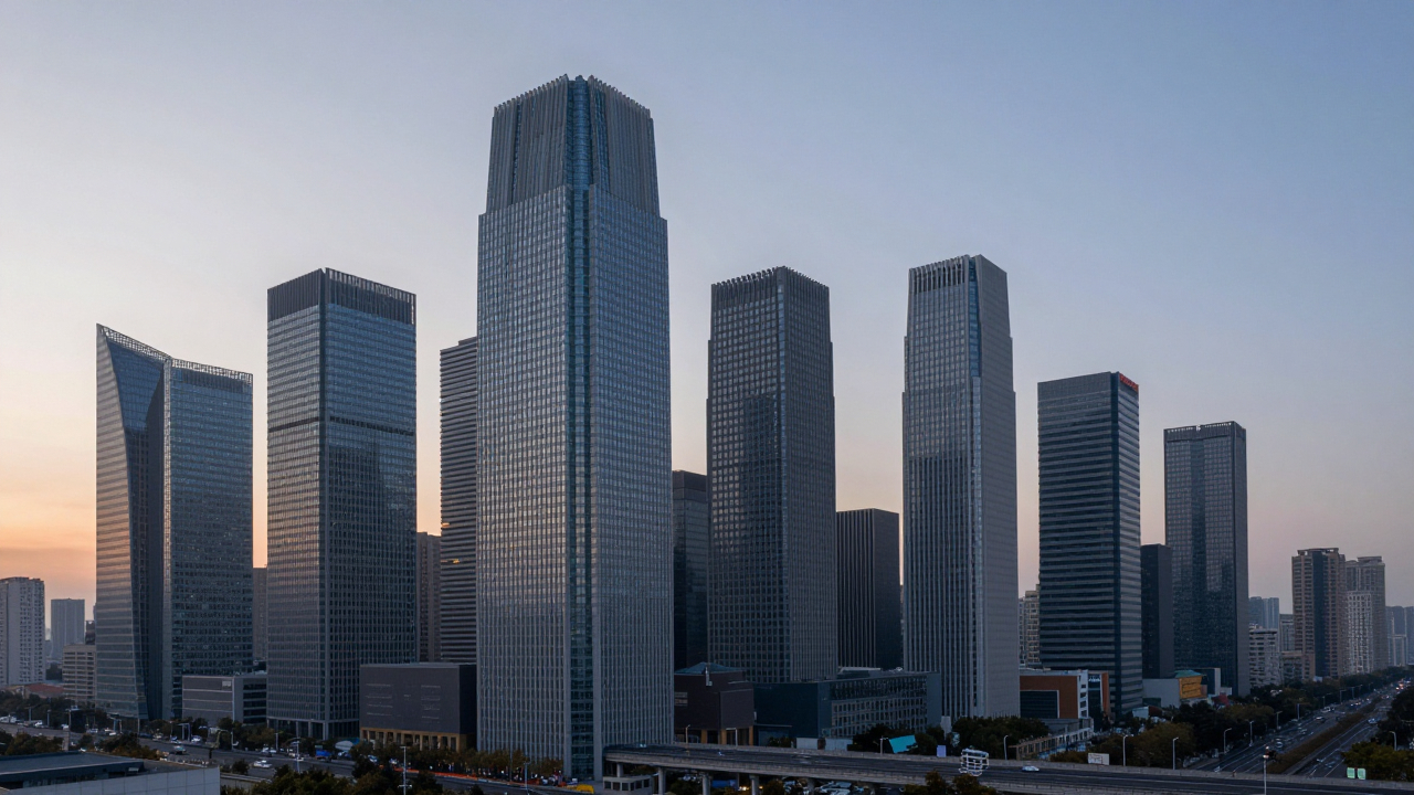 Небоскрёбы на рассвете, стекло и сталь, город.