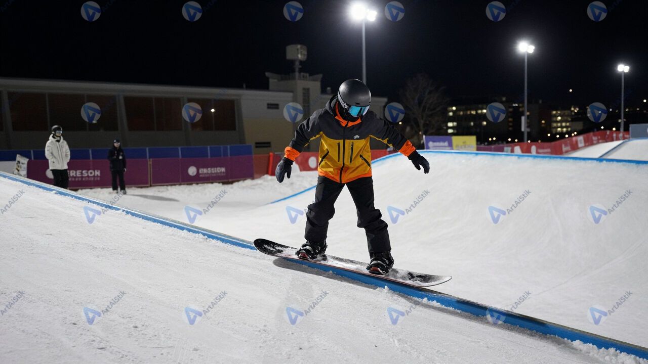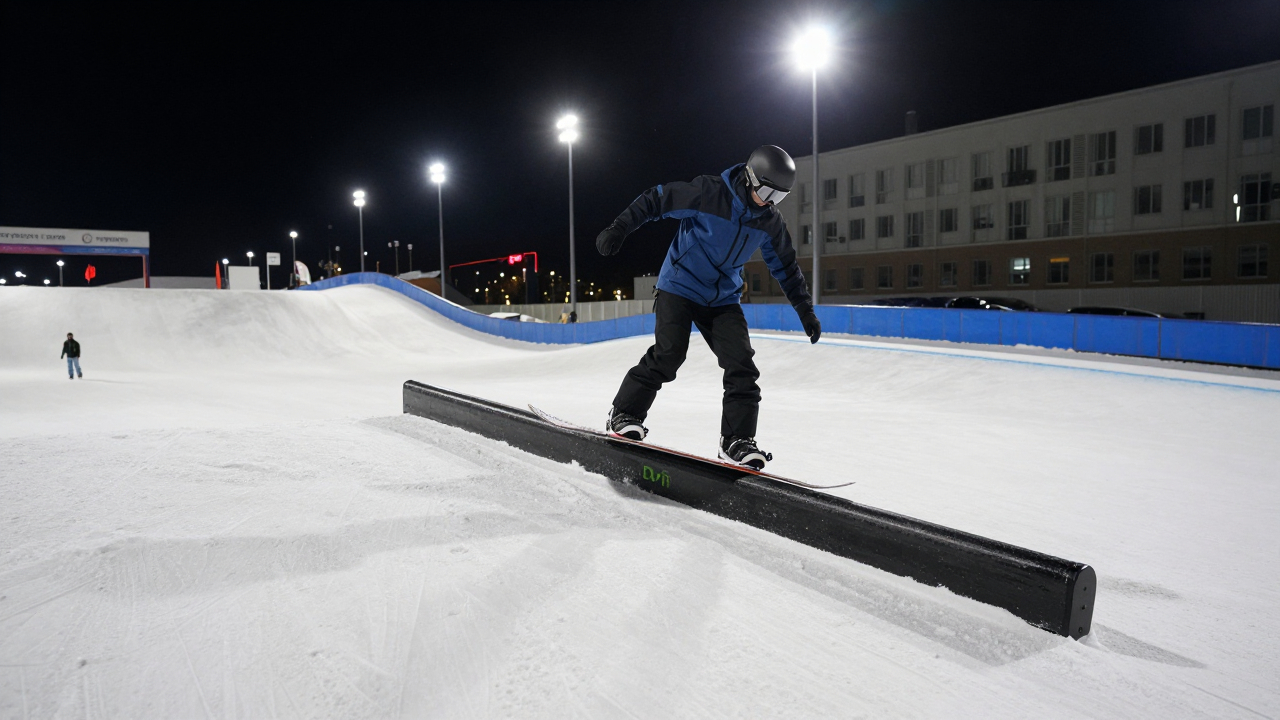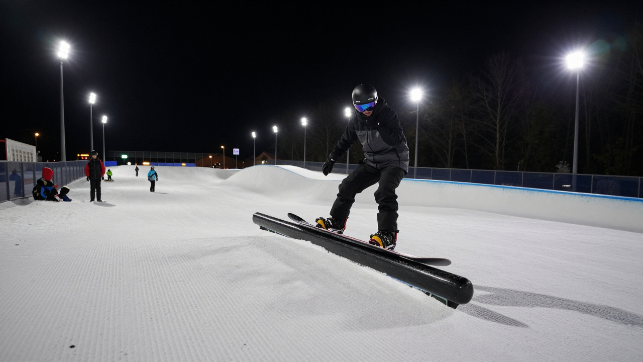 Сноубордист на периле в городском сноупарке, ночная подсветка.