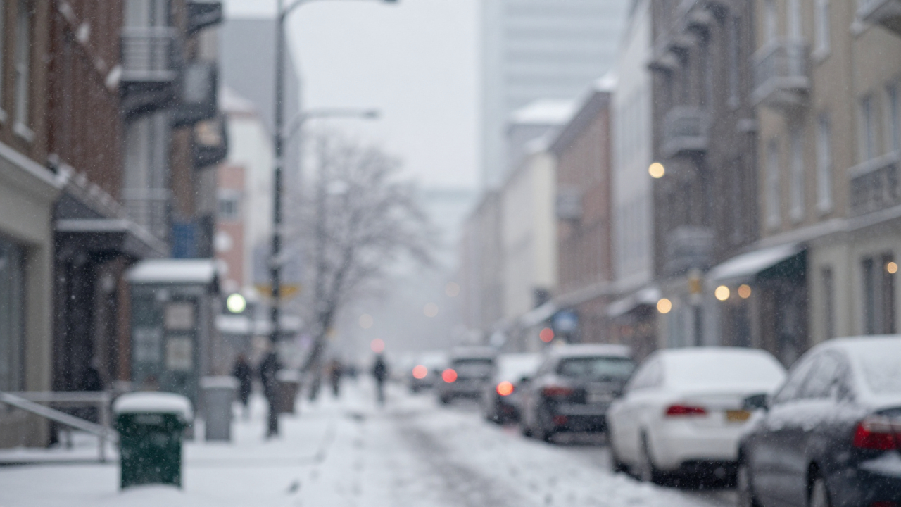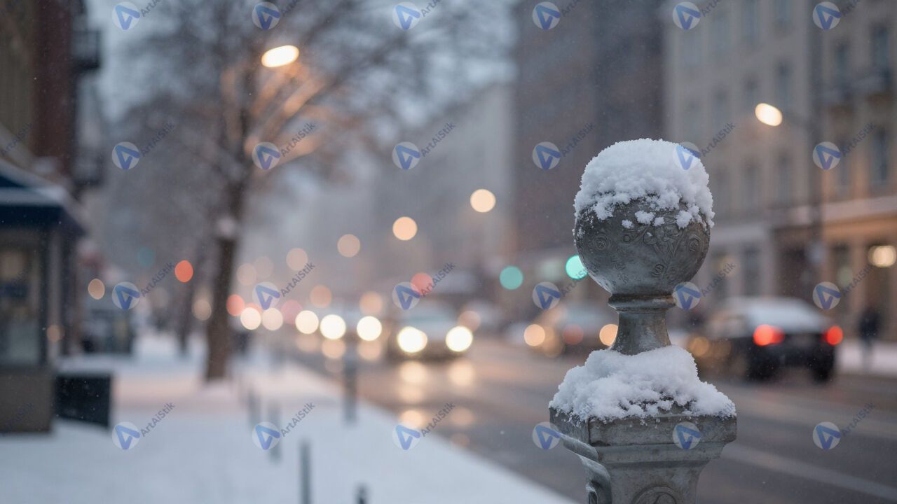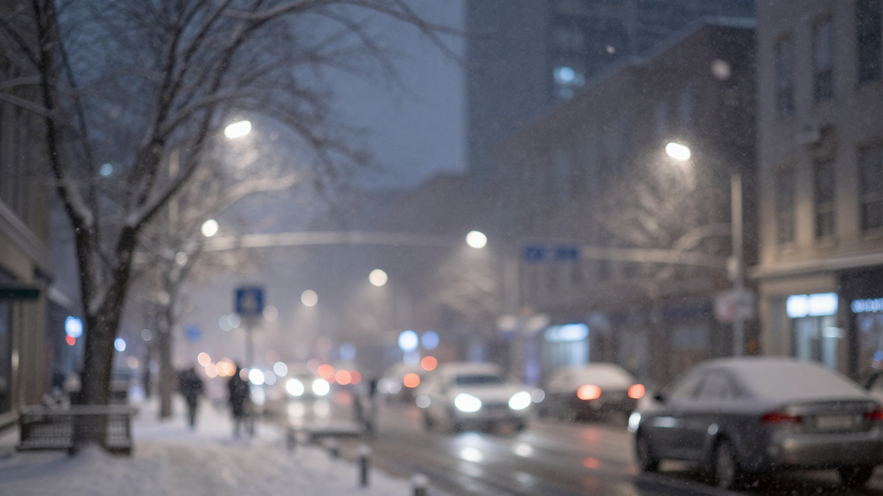 Снегопад в городе, крупные хлопья, размытые огни.