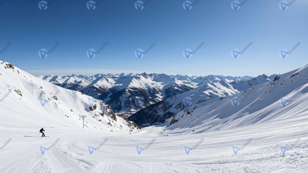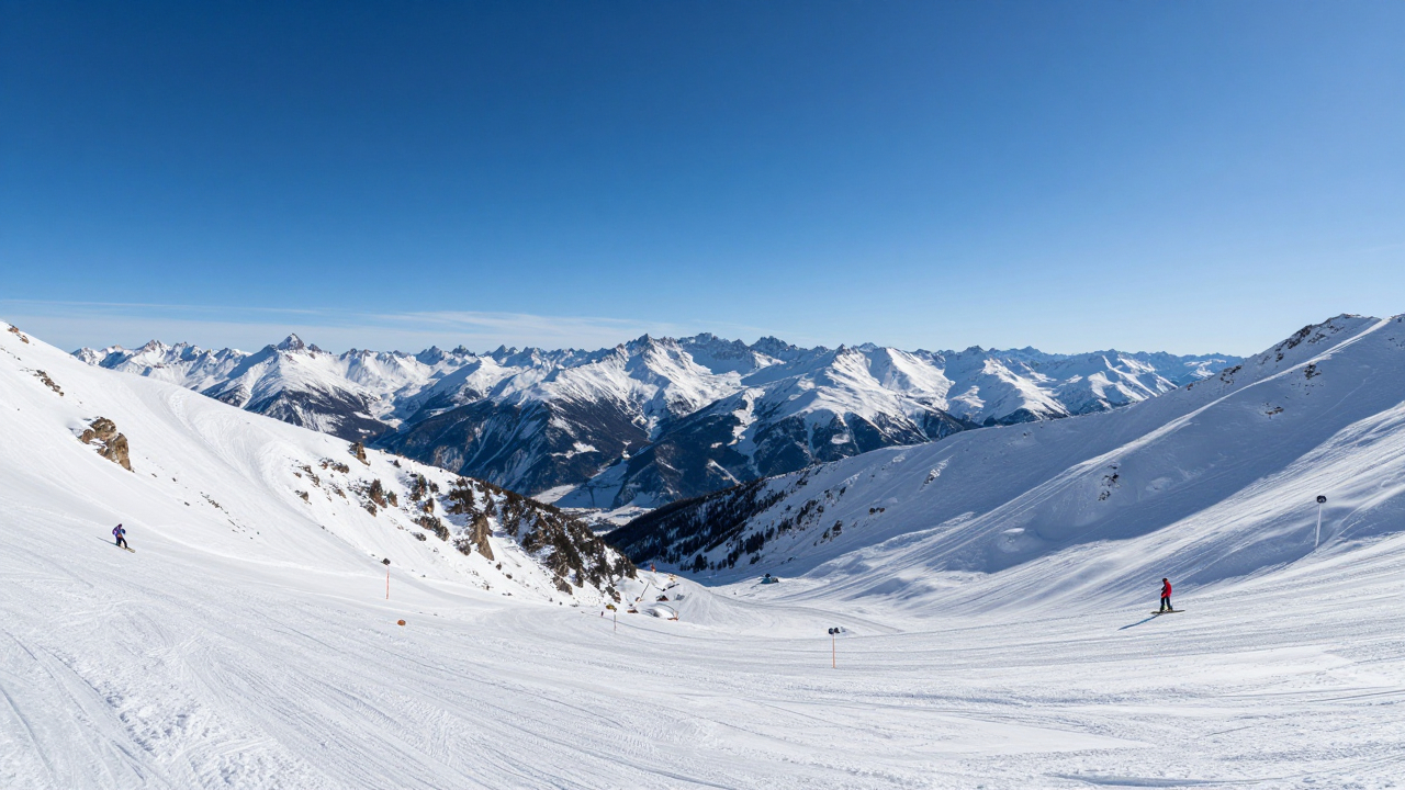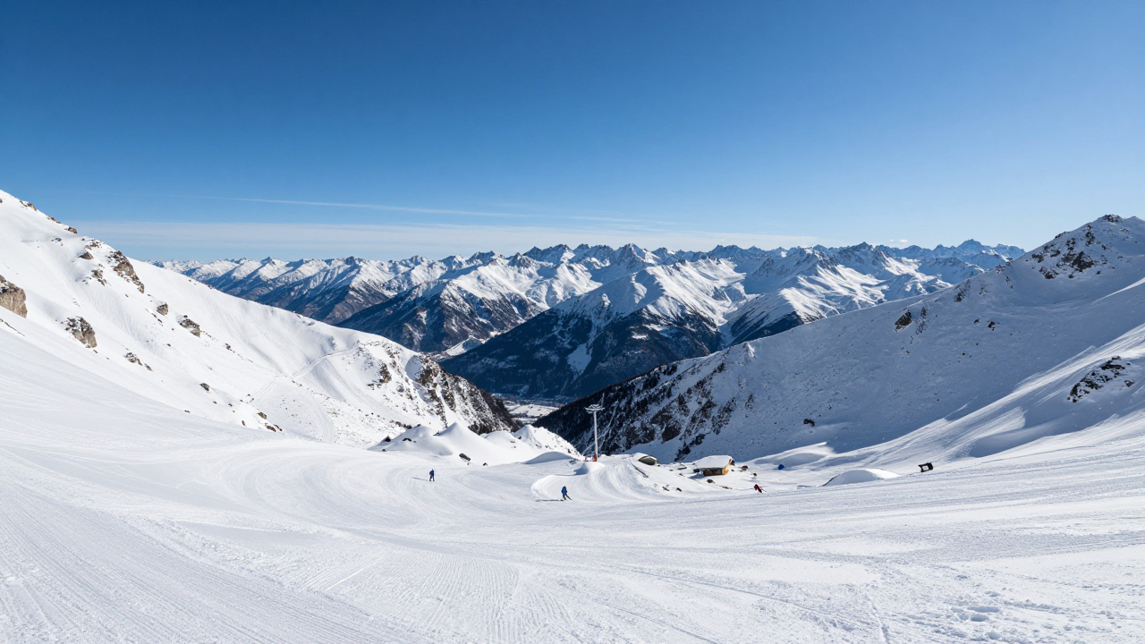 Снежная долина между горами, лыжня, безоблачное небо.