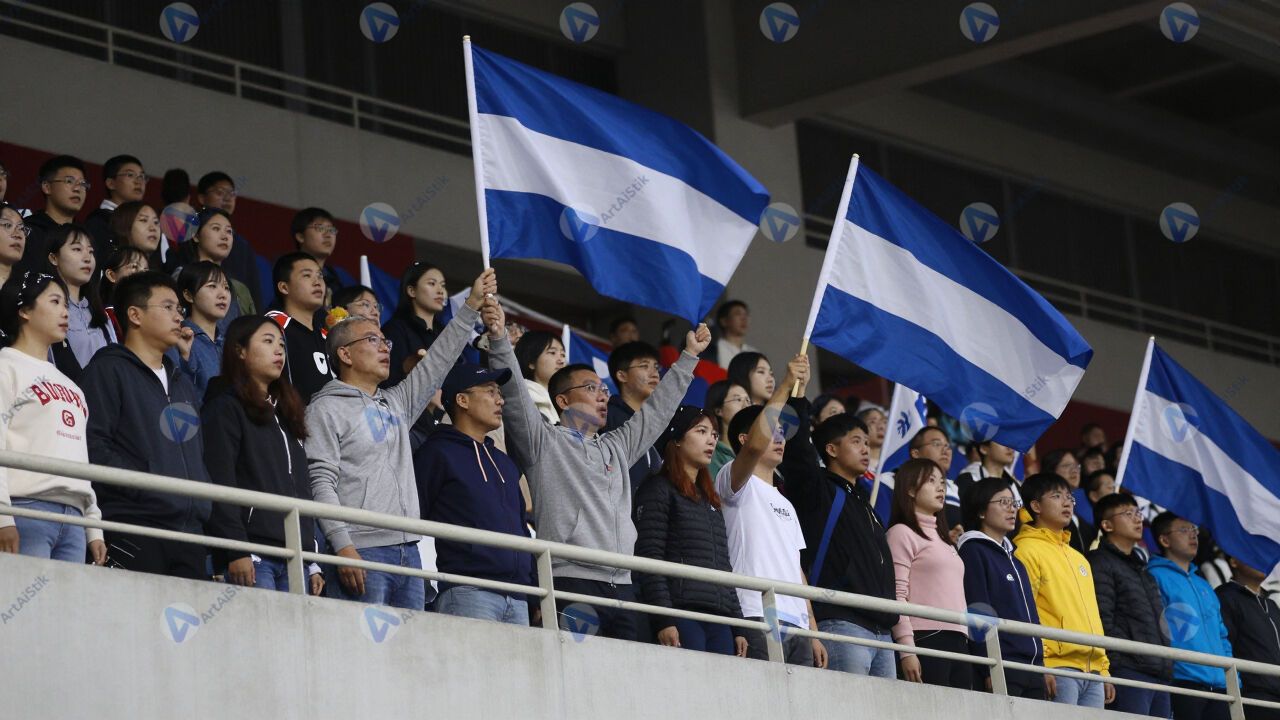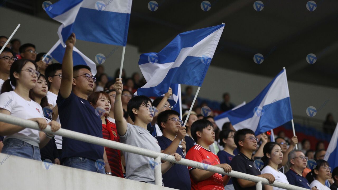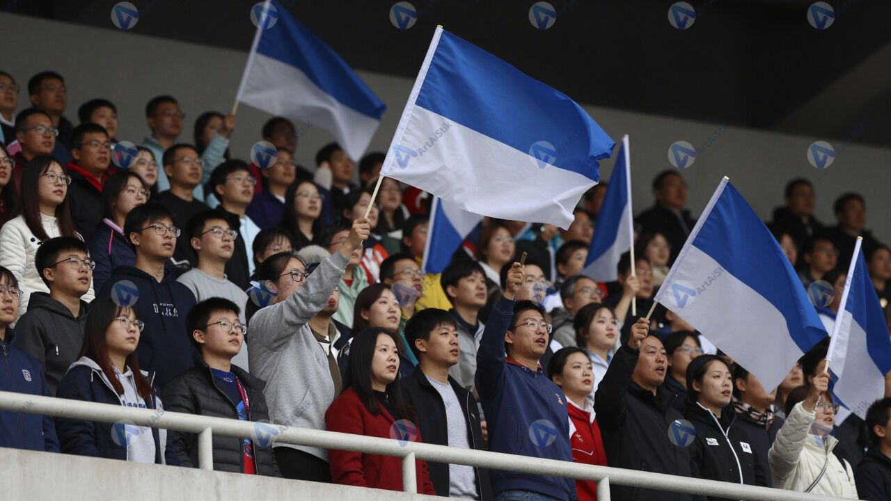 Зрители на трибунах стадиона машут флагами и кричат.