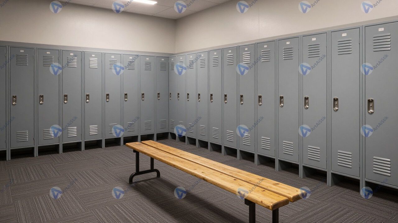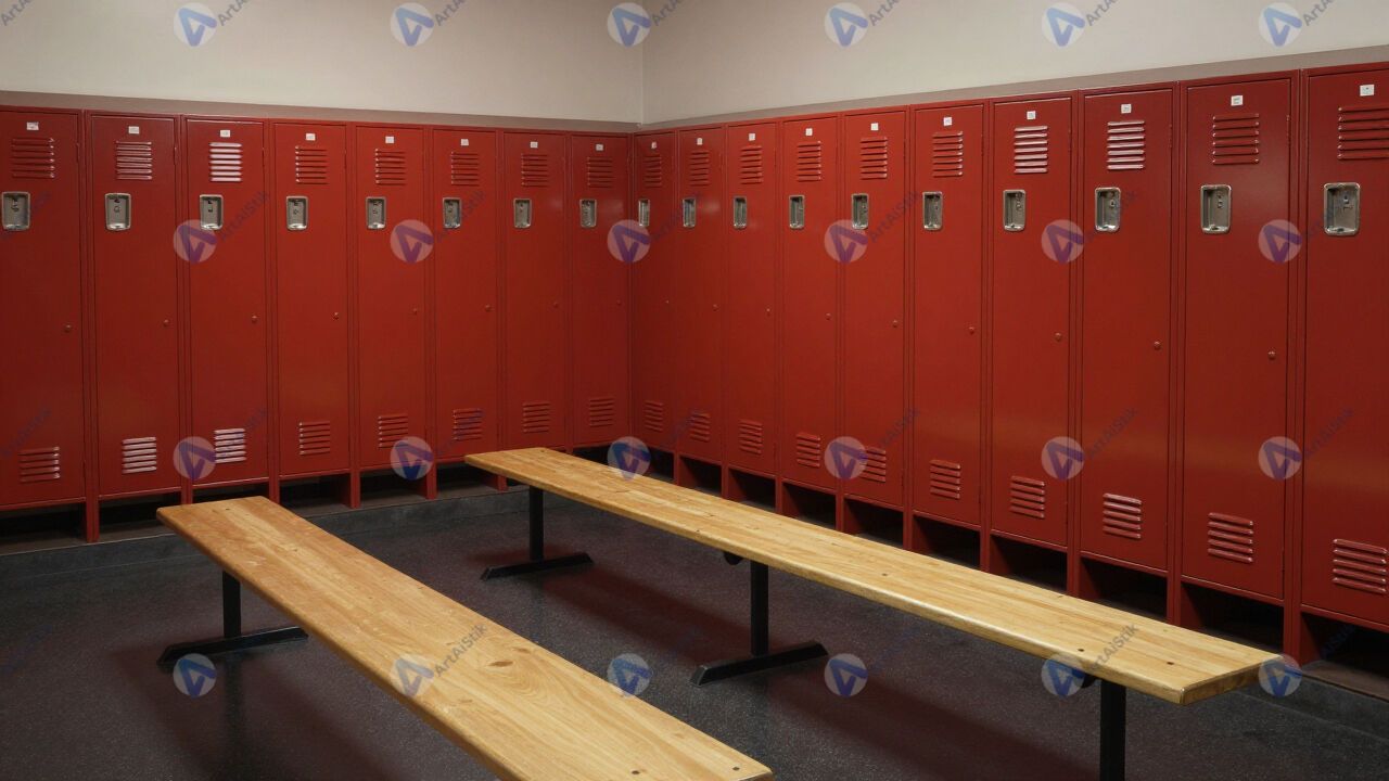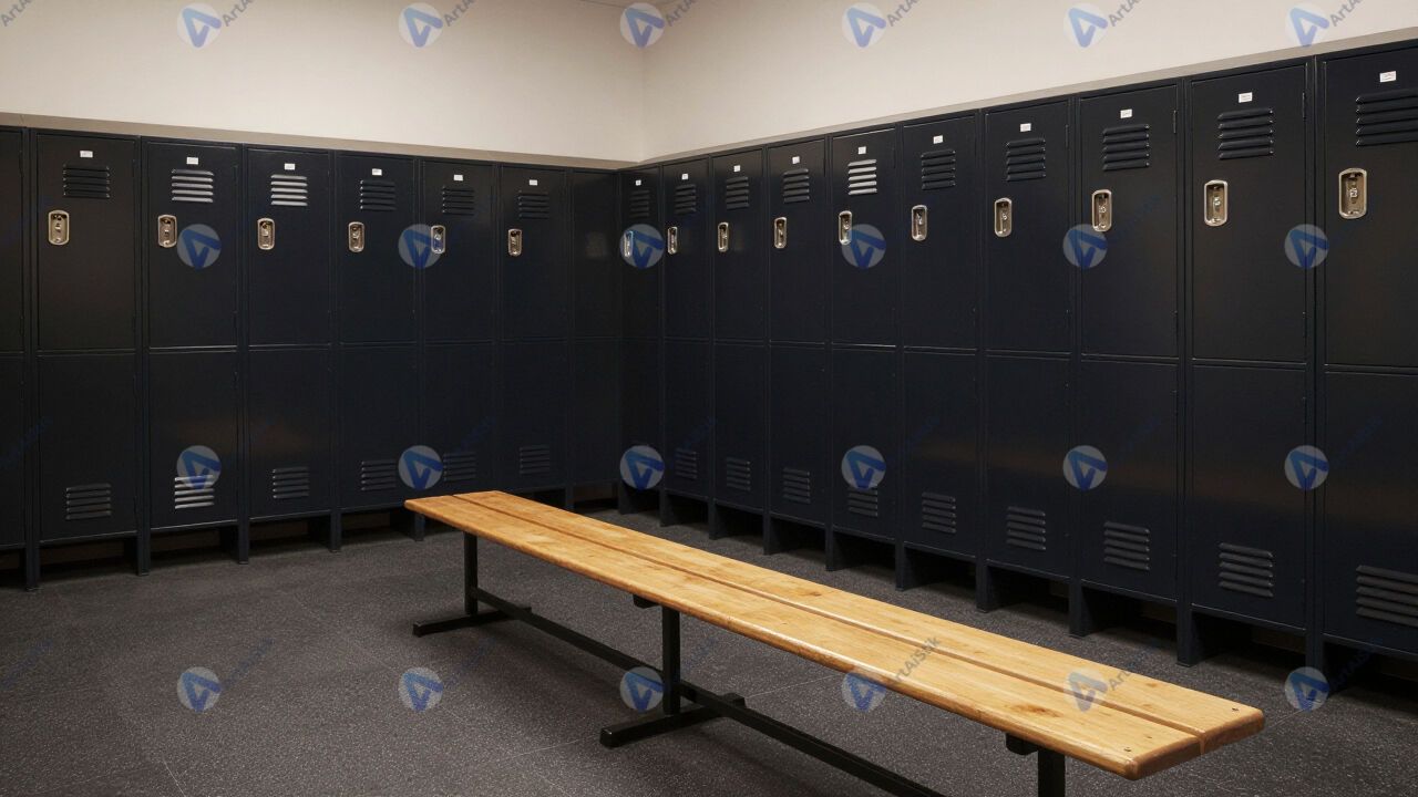 Спортивная раздевалка с лавками и шкафчиками.