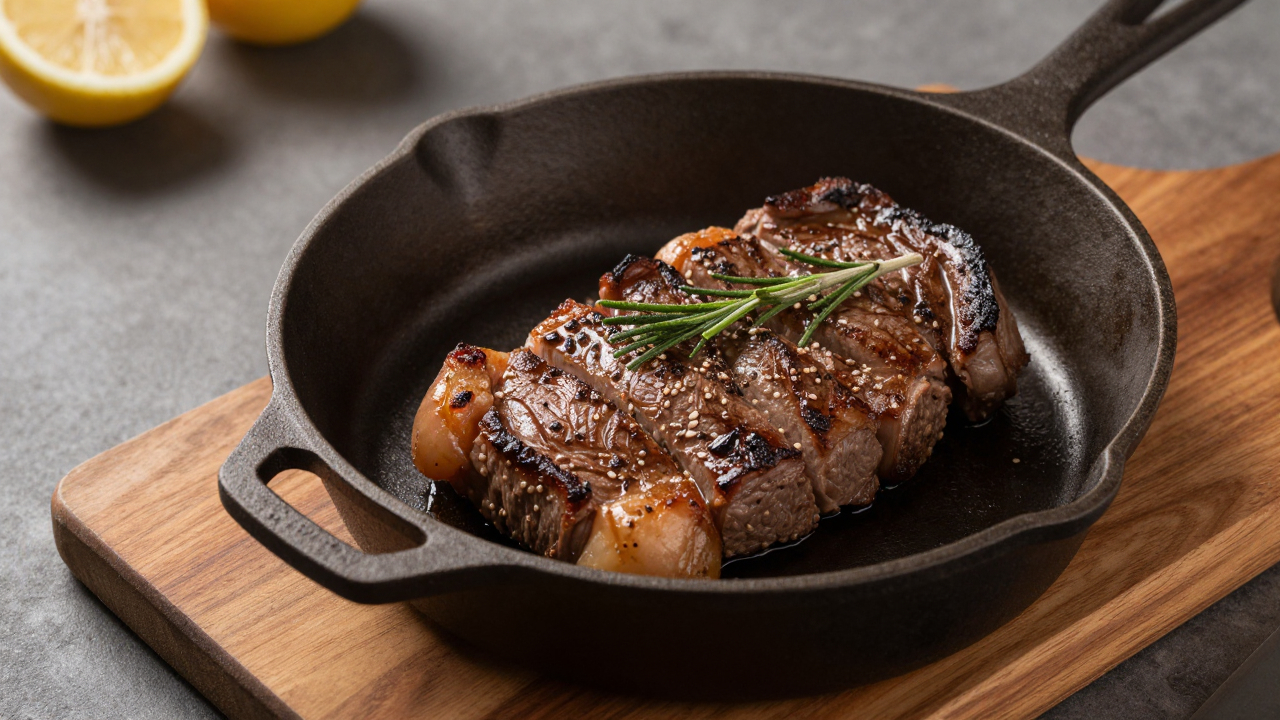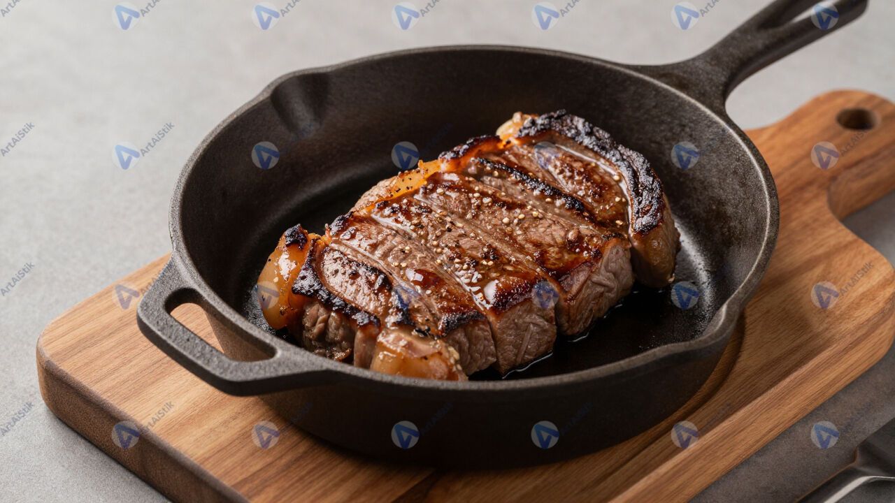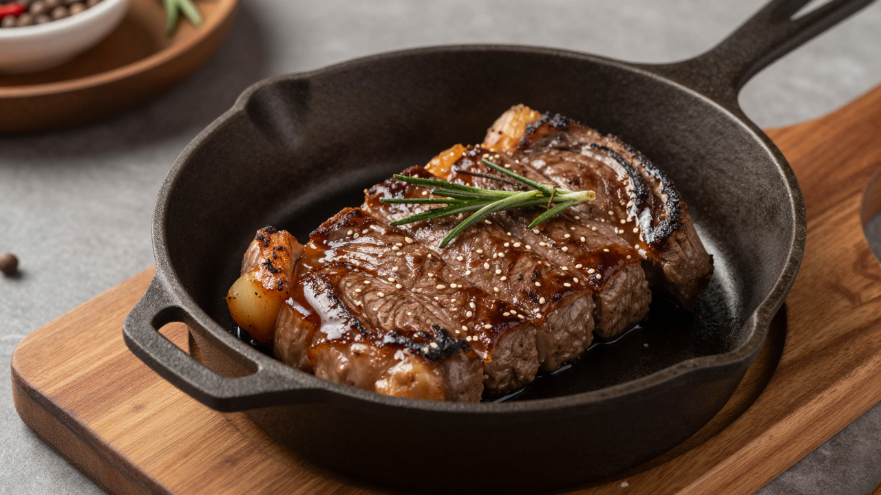 Стейк на чугунной сковороде, подача на деревянной доске.