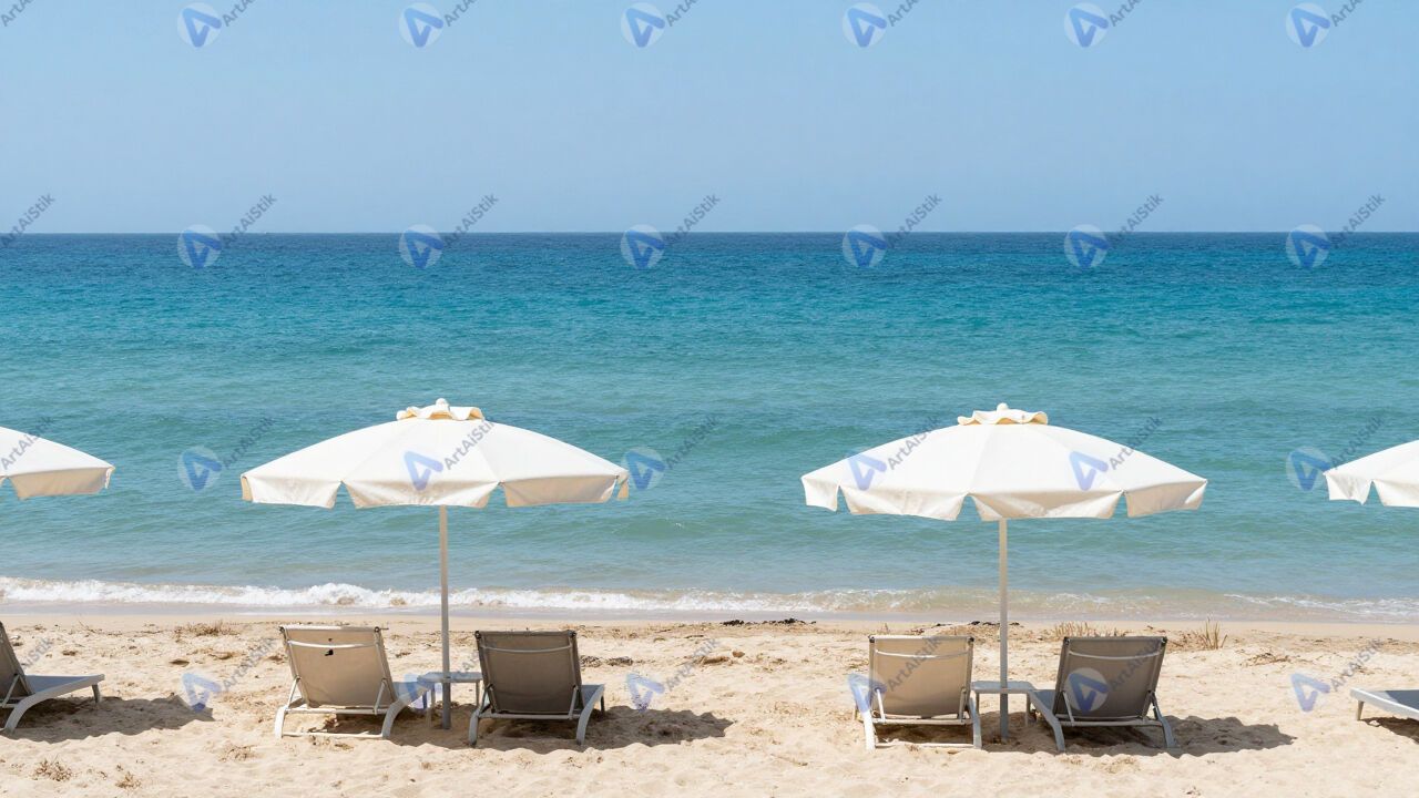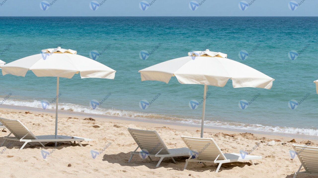 Пляж летом, зонтики, бирюзовое море, полдень.
