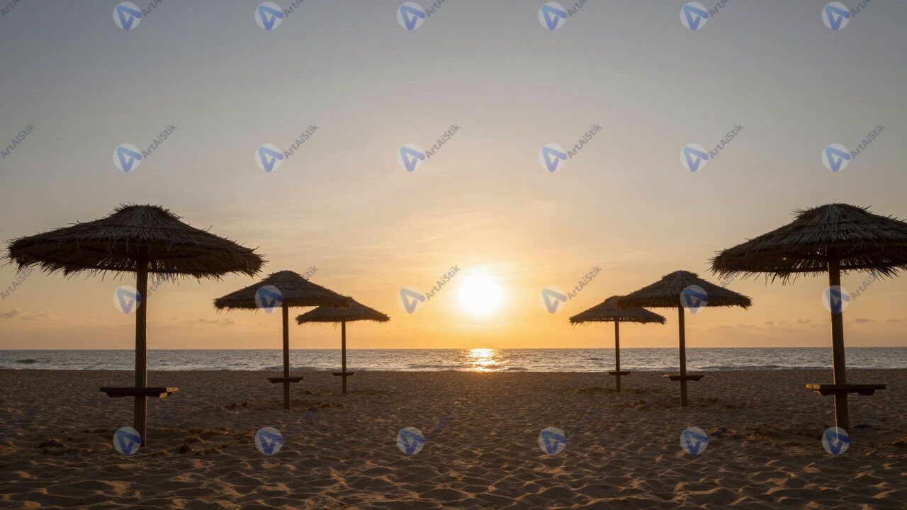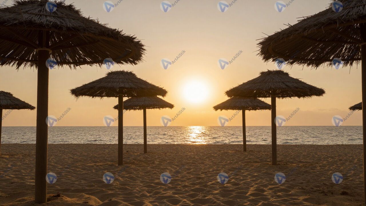 Пляжный закат летом, зонтики, море, золотая дорожка.