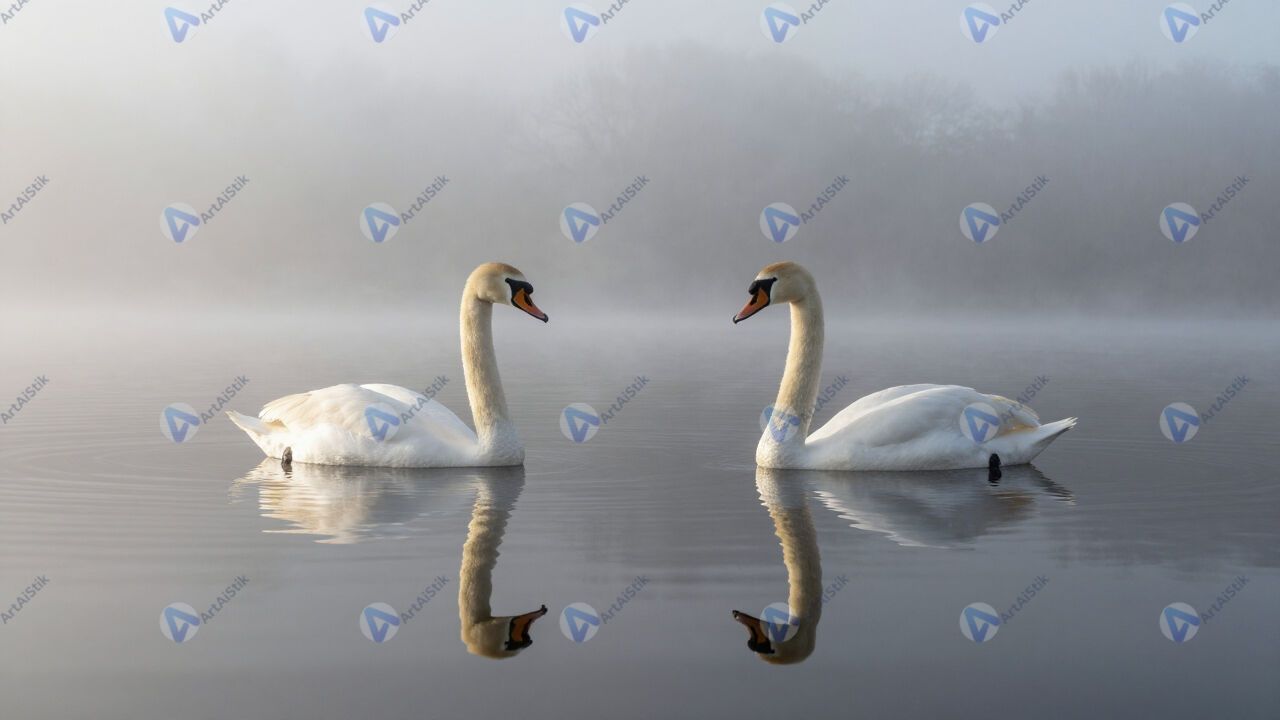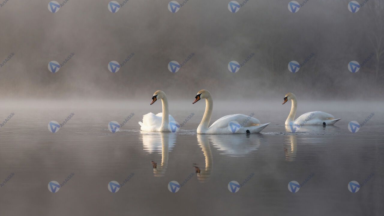 Лебеди на озере, отражение, утро, туман.