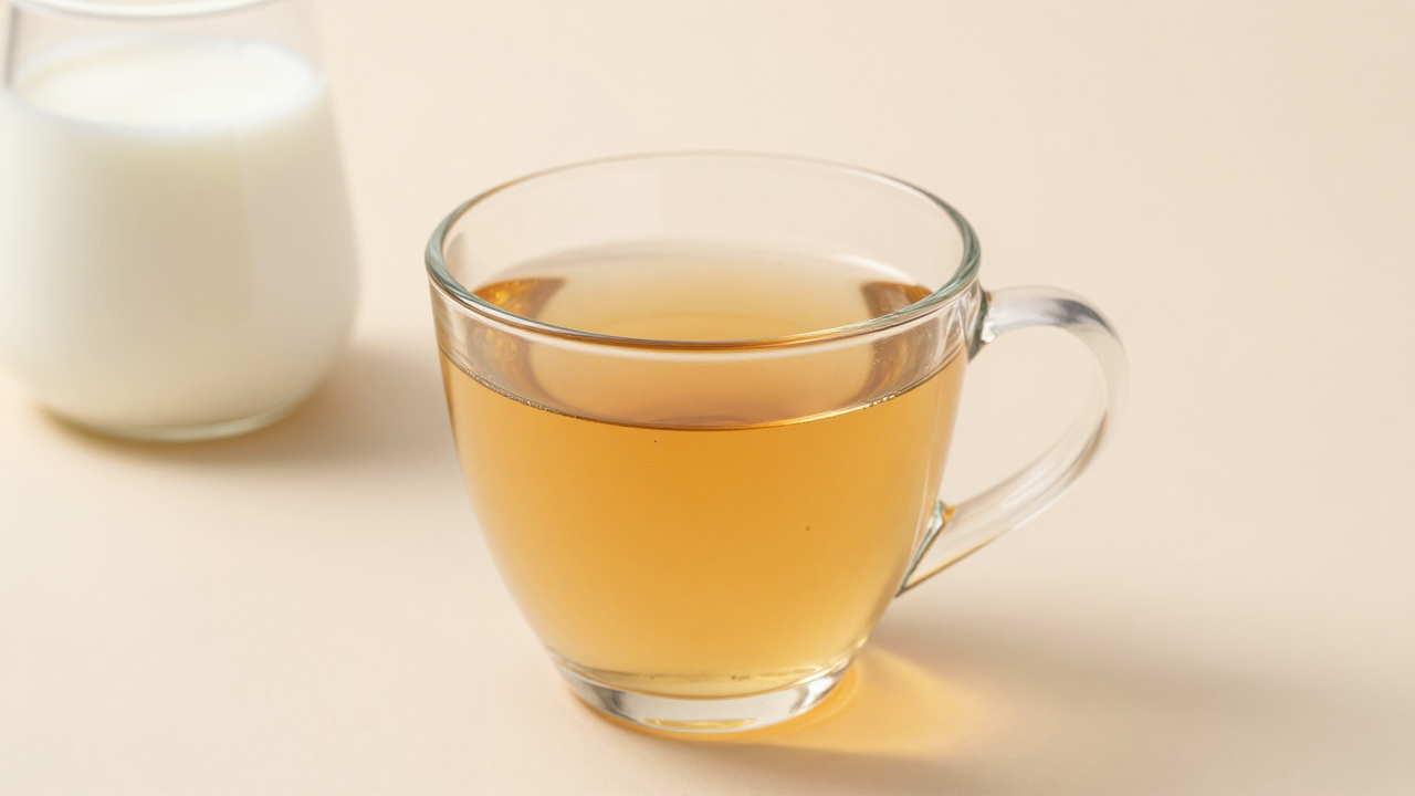 Чай с молоком в стеклянной кружке, мягкий бежевый оттенок.