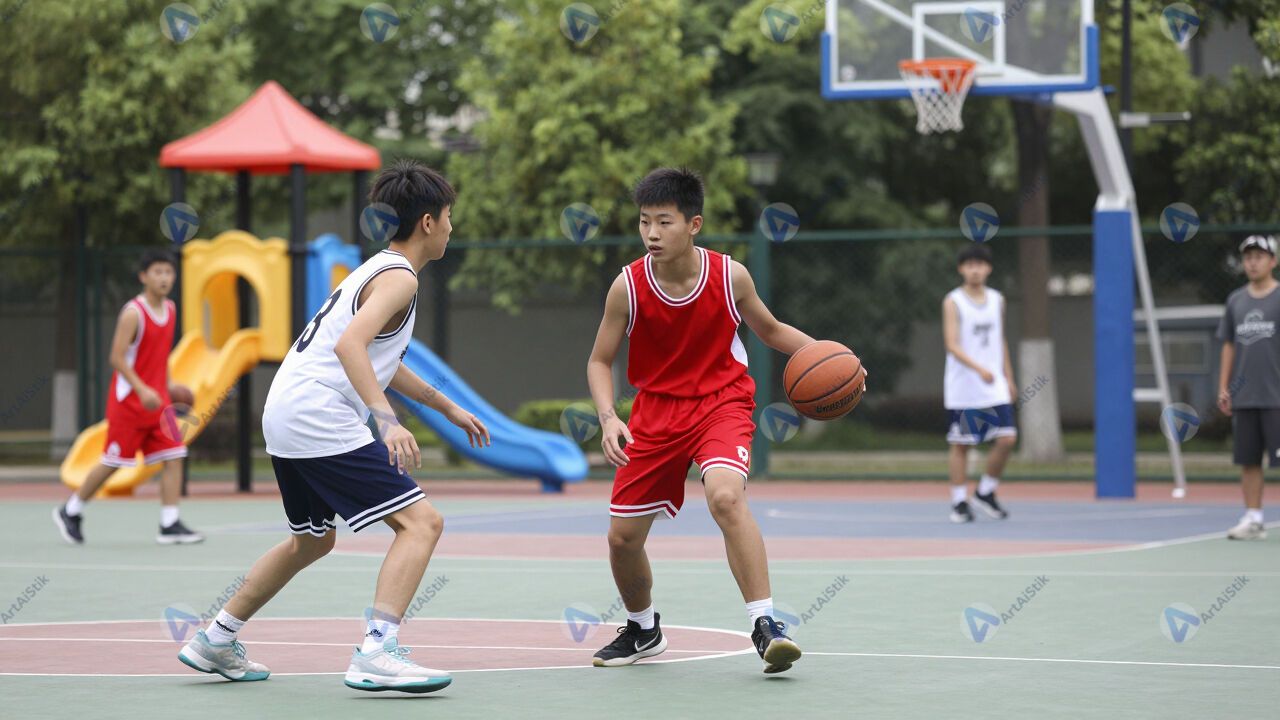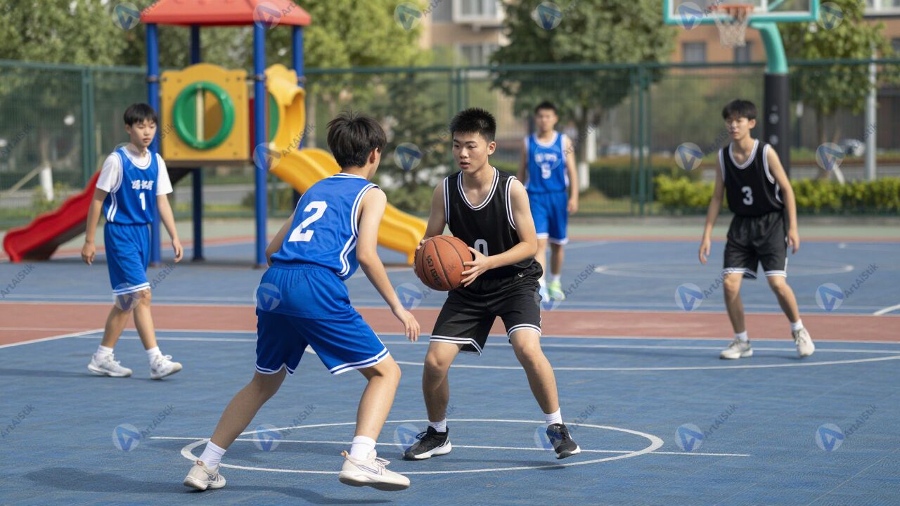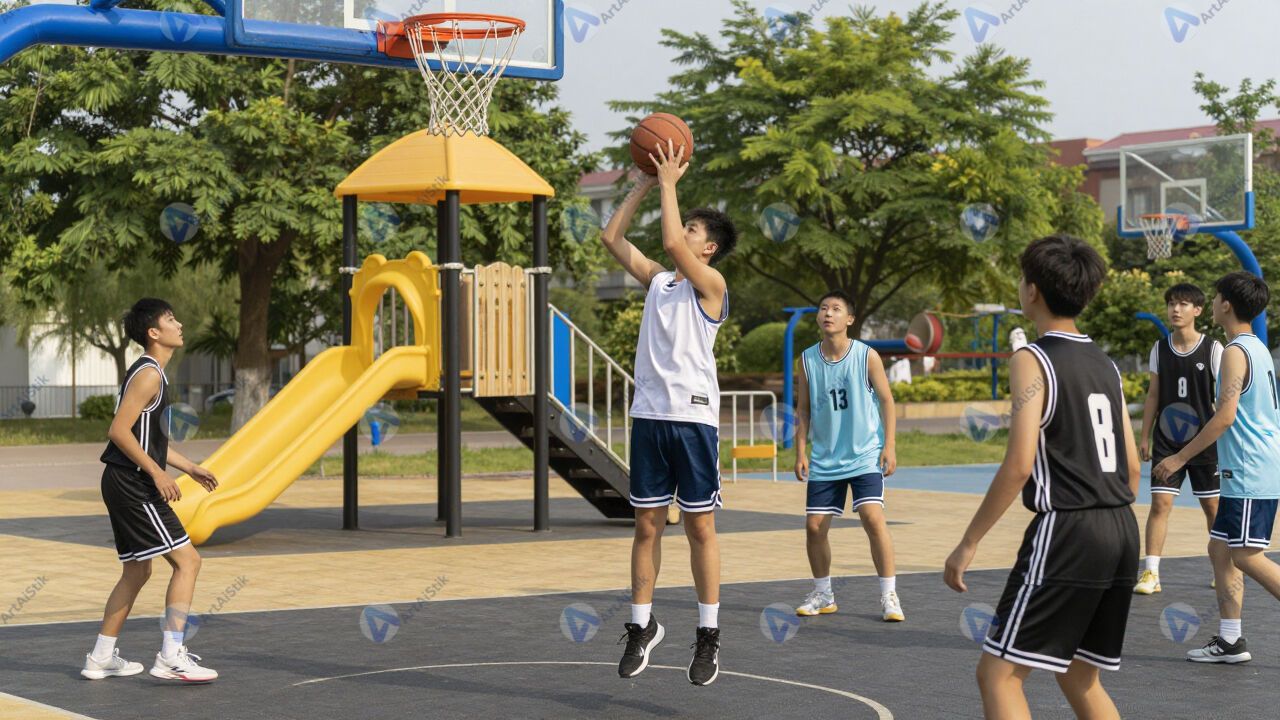 Подростки играют в баскетбол на уличной площадке.