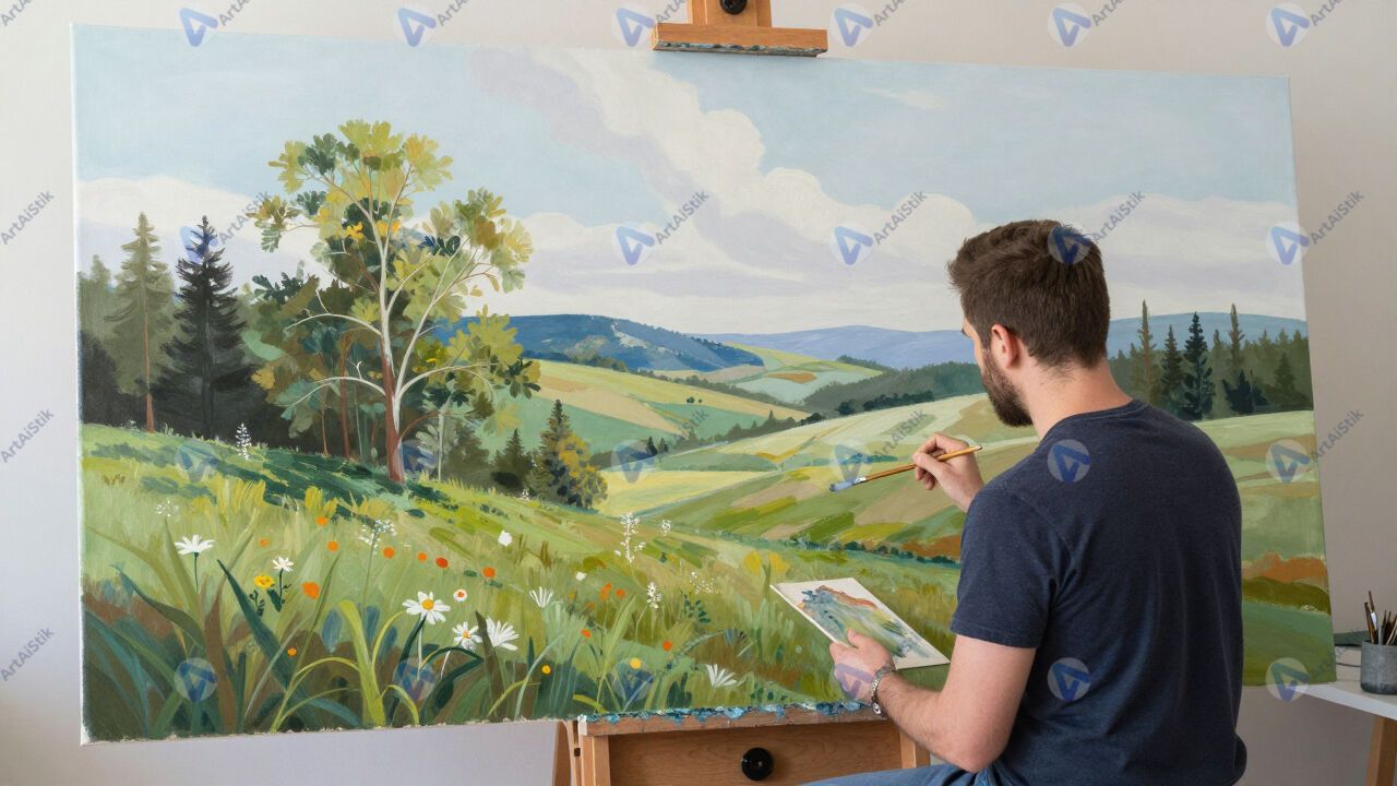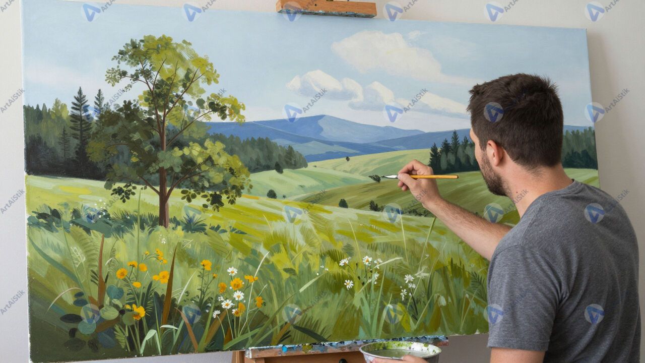 Художник рисует пейзаж акрилом на большом холсте.