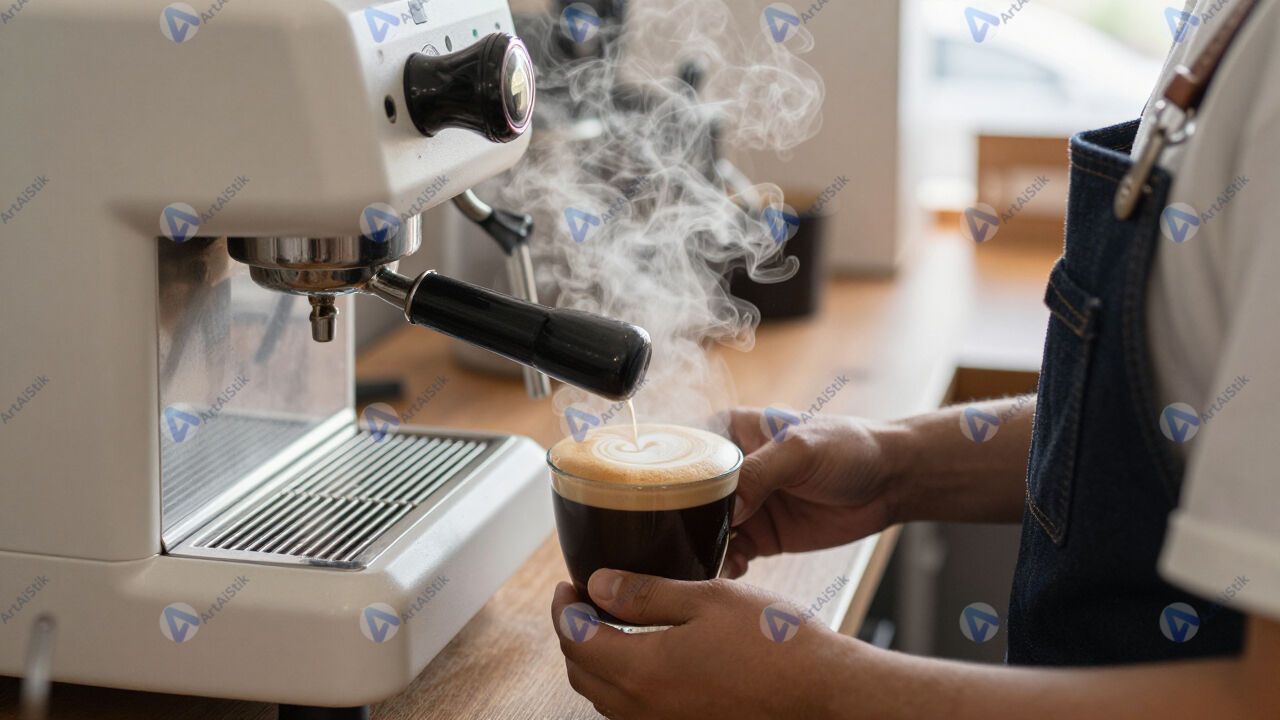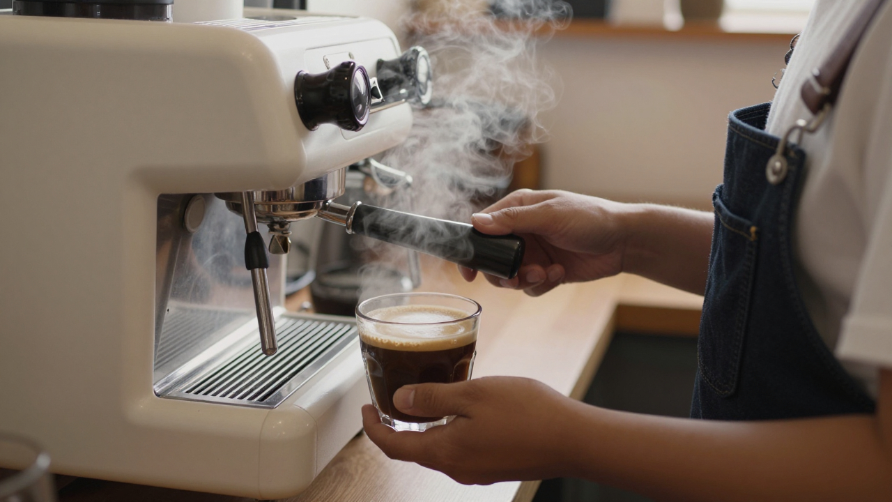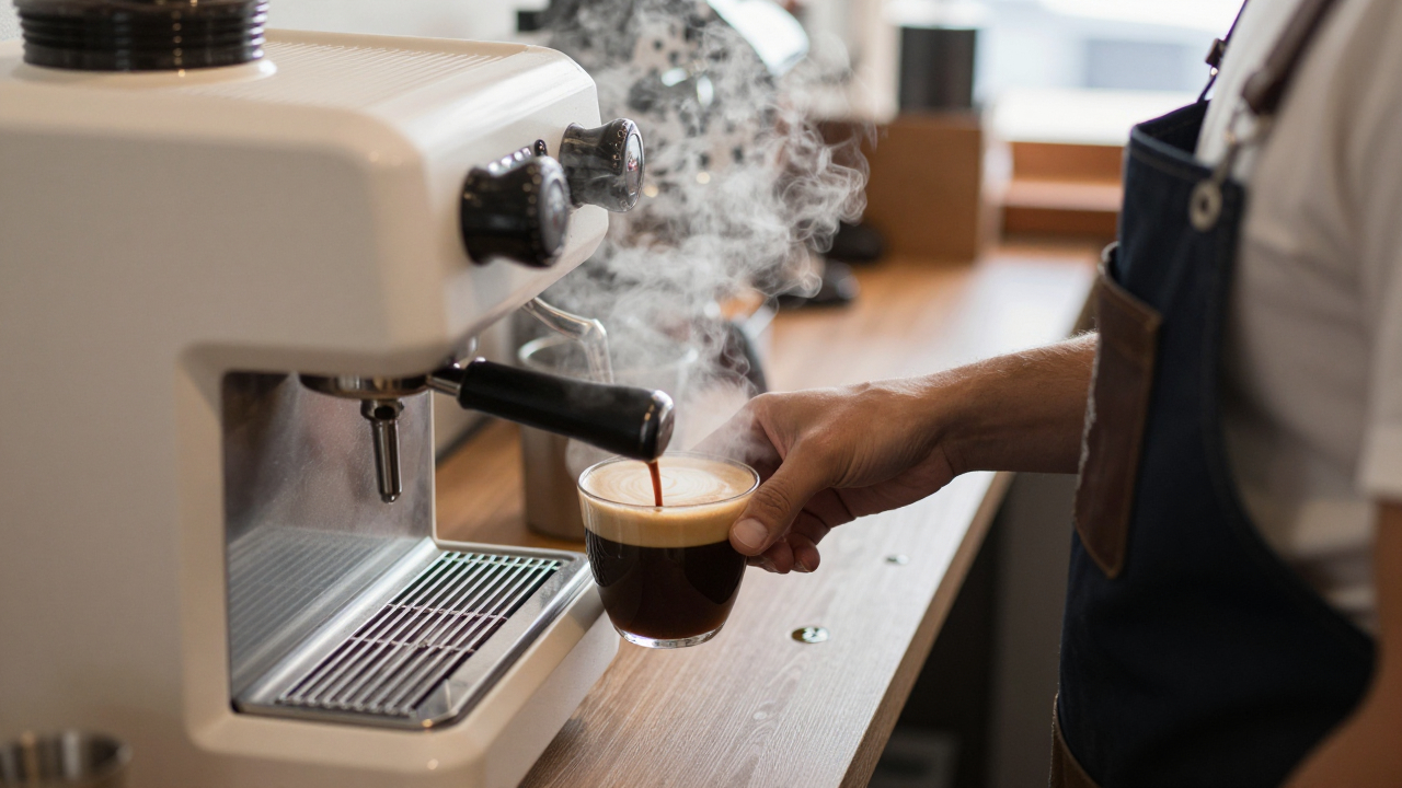 Бариста готовит кофе за стойкой, пар от машинки.